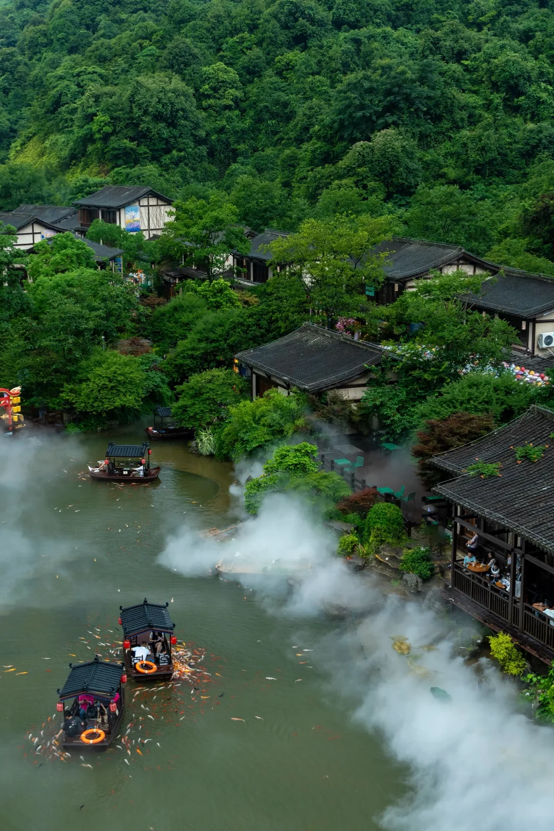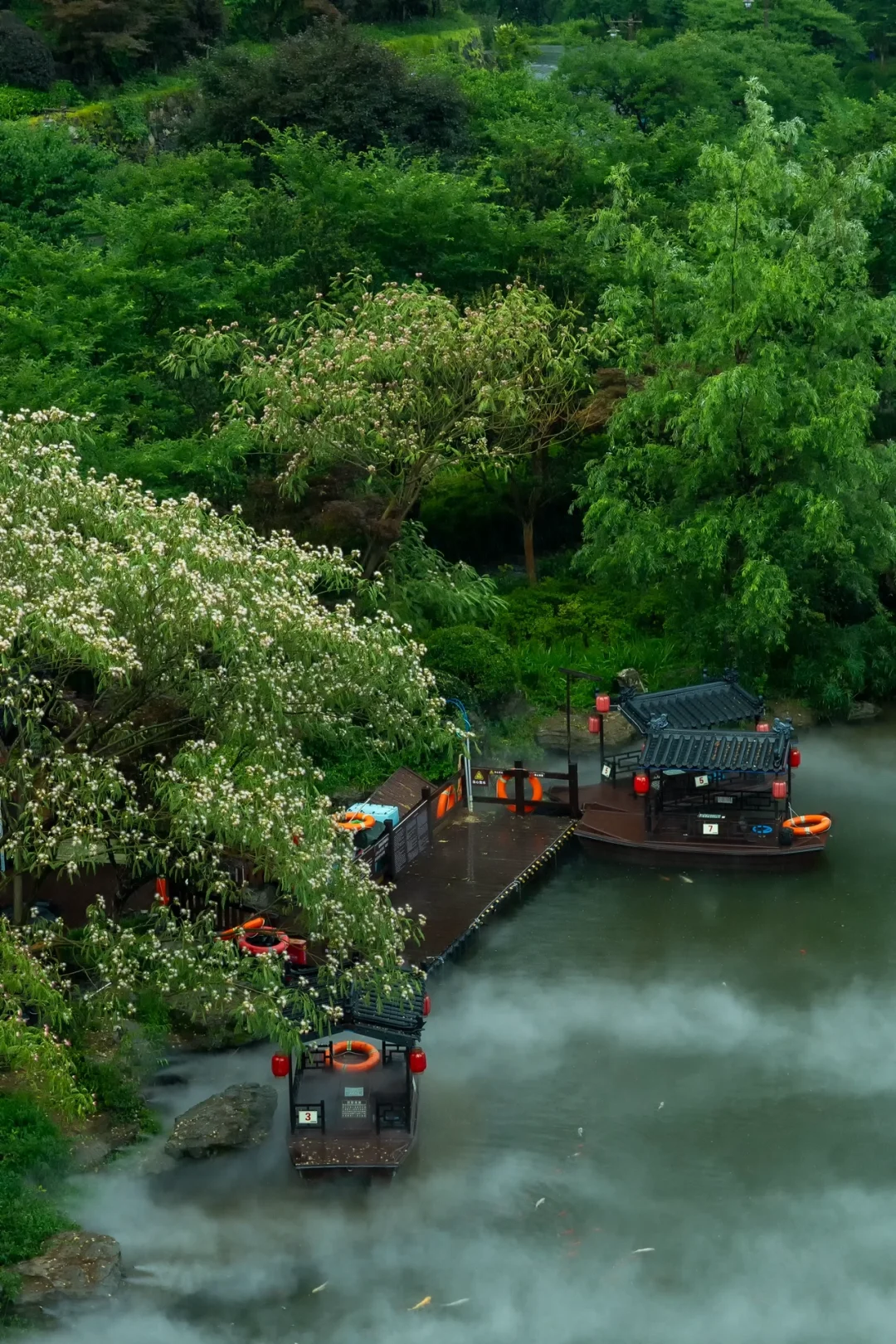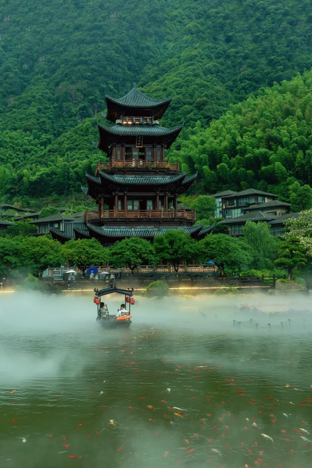阁楼、村落、烟雨泛舟像是水墨画一样,