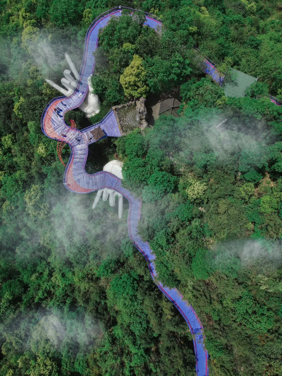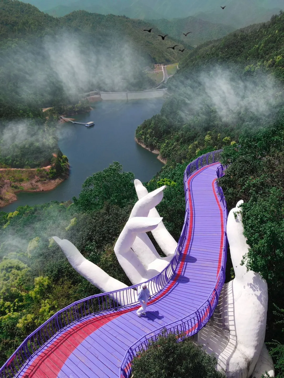被巨型白玉手掌托举的紫色栈道!漫步云雾缭绕的空中步道,水墨画般的富春江景尽收眼底,阴雨天自带仙气滤镜更出片。