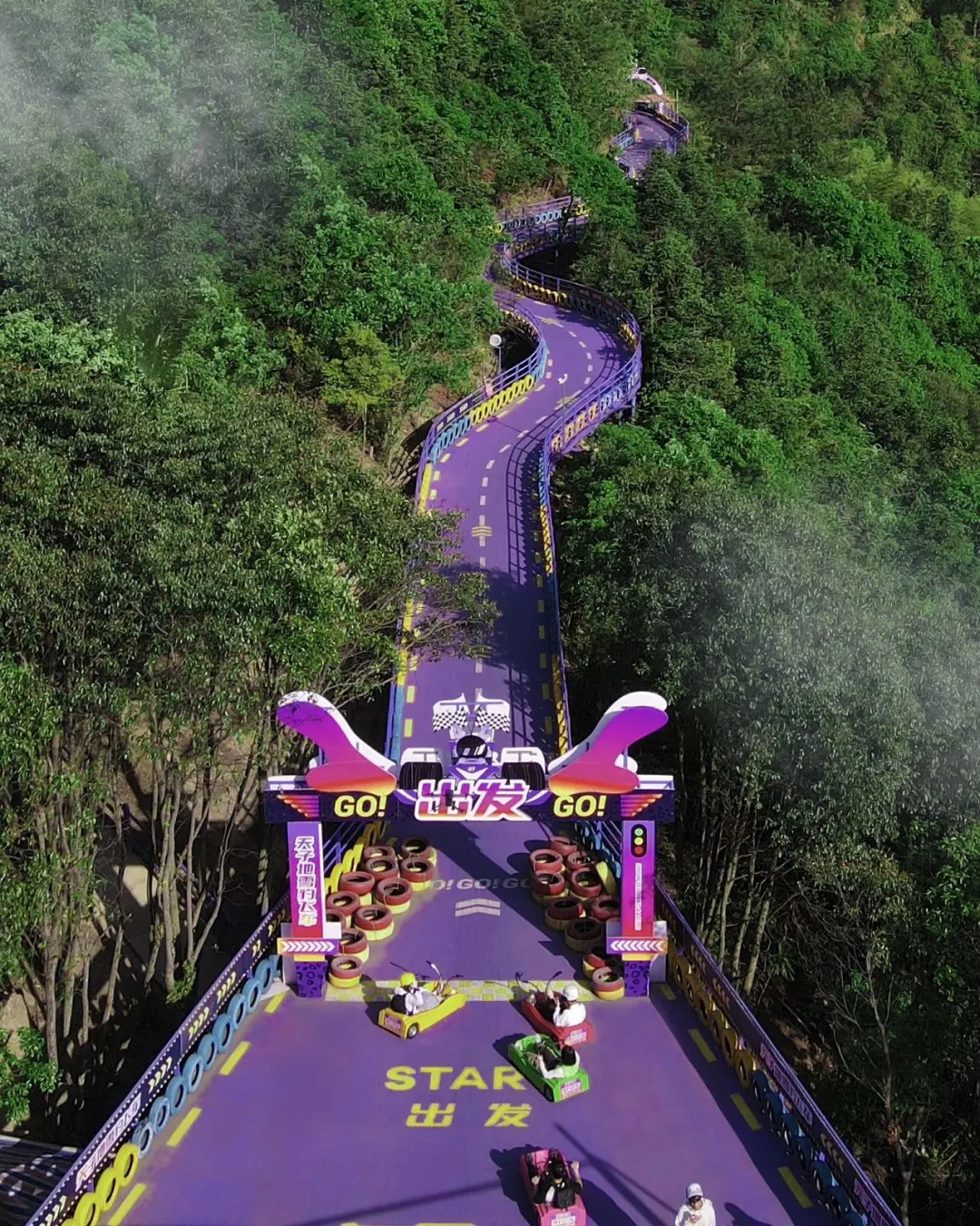 入口➠魔毯上山➠紫绫纤手➠云梯天桥➠天空之镜➠幻石龙宫or飞梯➠雪豹飞车➠紫龙峡高空漂流➠恐龙谷➠裸眼7D太空飞船➠出口