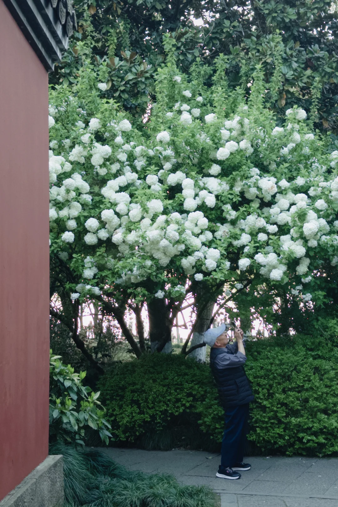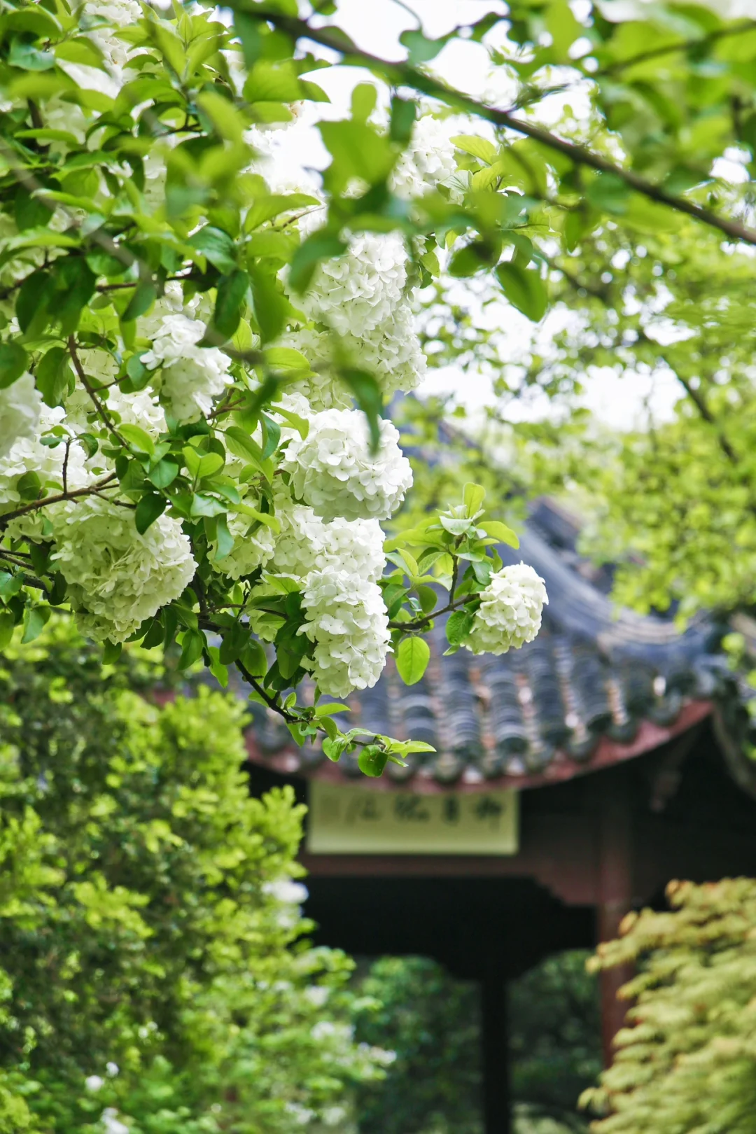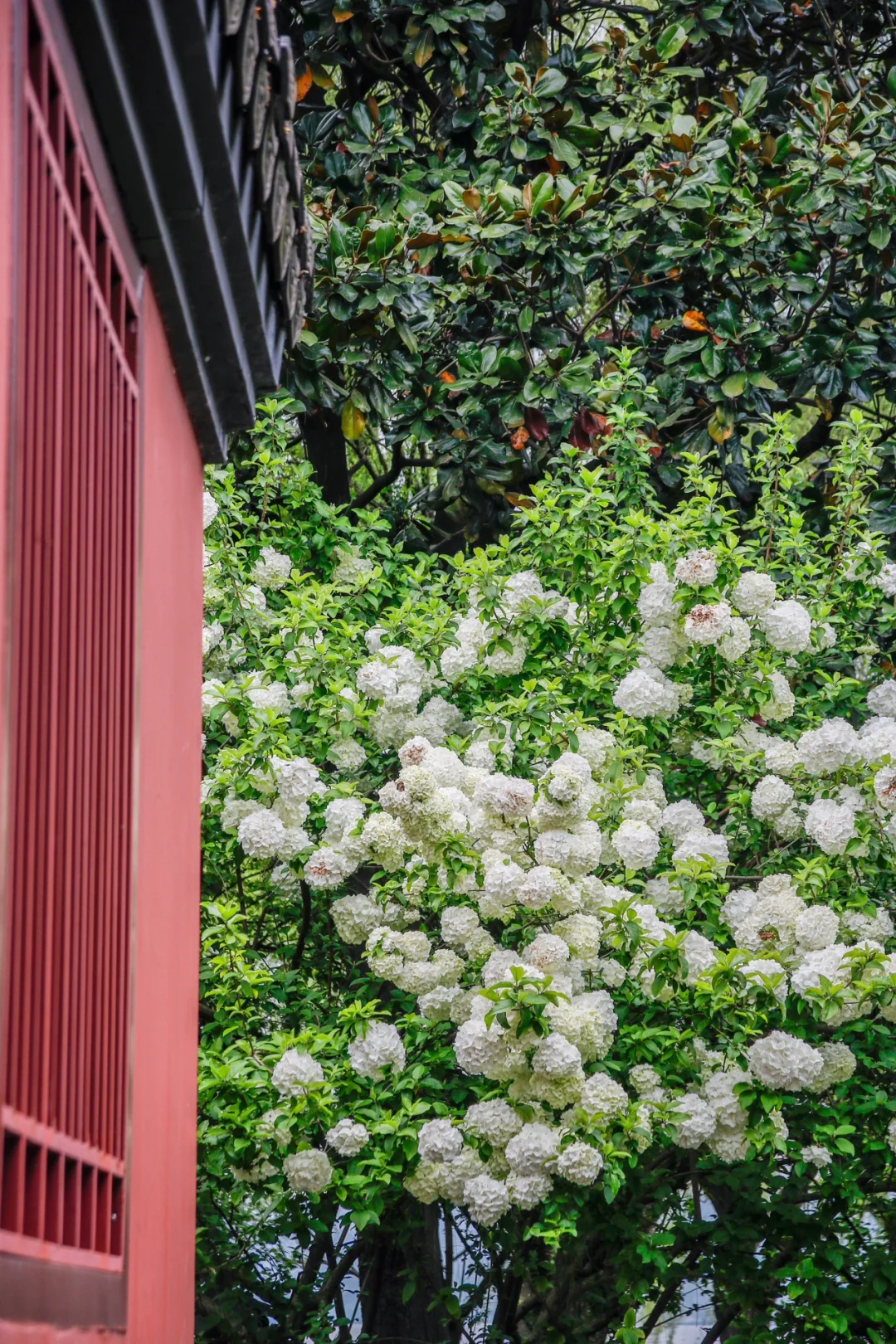 红墙、青瓦、小亭子与白色木绣球结合,中式审美不一样的风格,木绣球在外面不用买门票进去就能拍到