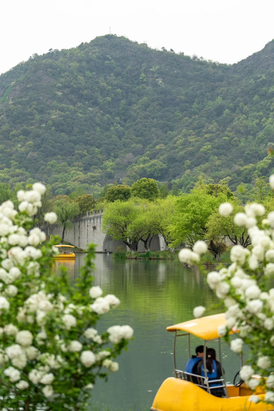 🌸大黄鸭乐园附近的木绣球临水而种,与湖中的小黄鸭船相互映衬,充满了童趣。在这里可以以湖面、游船为背景,拍出春日氛围感满满的照片。