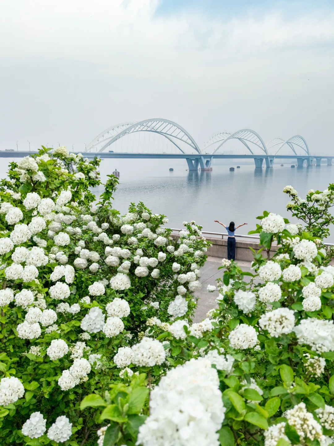 桥和木绣球结合不一样的视角,但是需要无人机航拍才好看