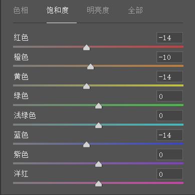 • 黄色:色相-1,饱和度-14,明亮度-2(统一黄色调)