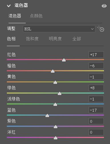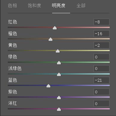 • 蓝色:色相-17,饱和度-14,明亮度-21(使蓝色偏向青色,整体色调更和谐)