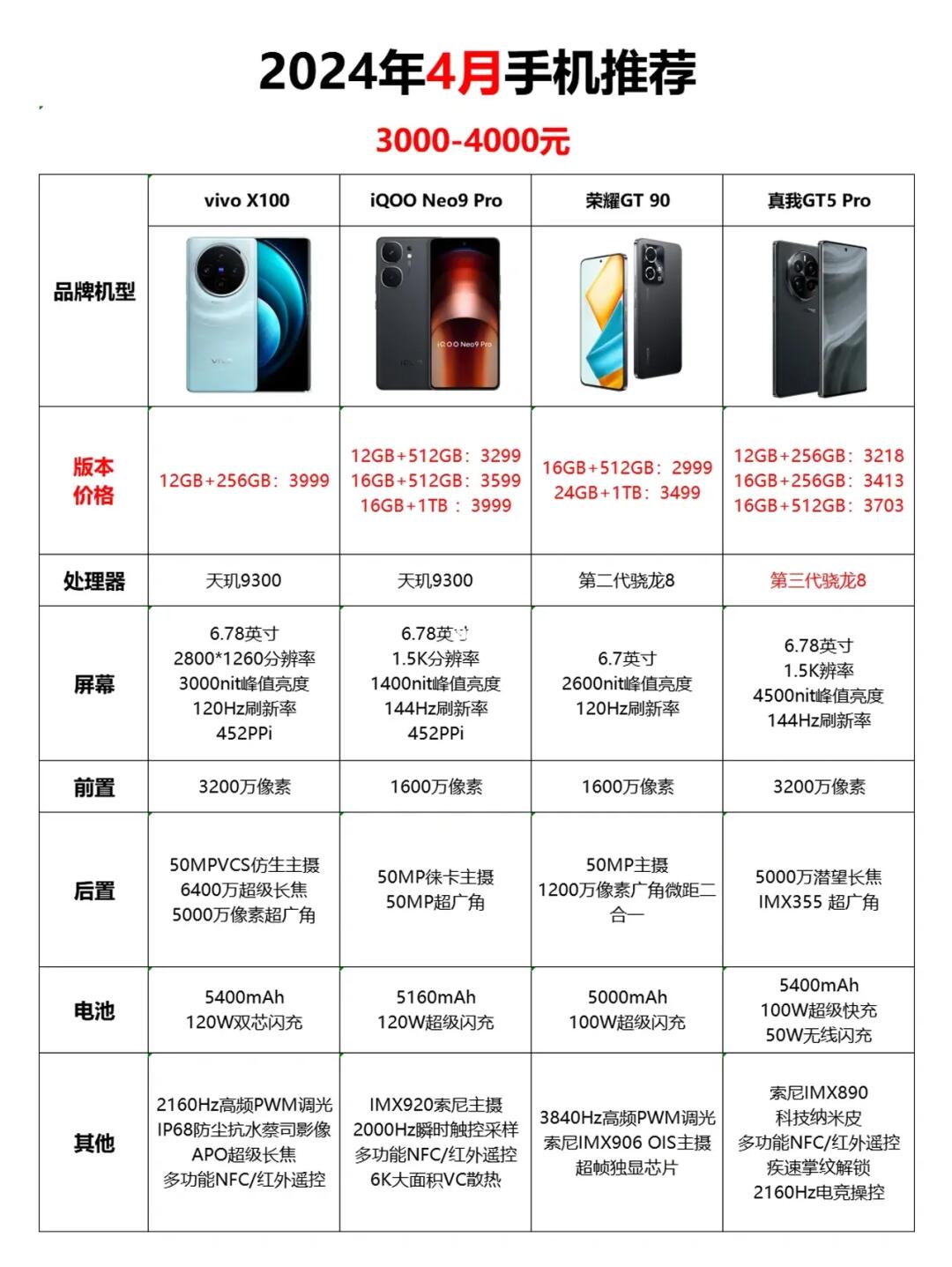 [斜眼R]对于追求性能又要兼顾拍照📸的话,3000-4000这个区间可以参考下头图这8款手机型号,荣耀100 pro,小米13,iQOO12,魅族21,vivo x100,iQOO neo9 pro,荣耀gt 90和真我gt5 pro。处理器配置主流的第二代骁龙8和天玑9300,部分拥有长焦潜望主摄,可以满足更高端性能需求的用户。