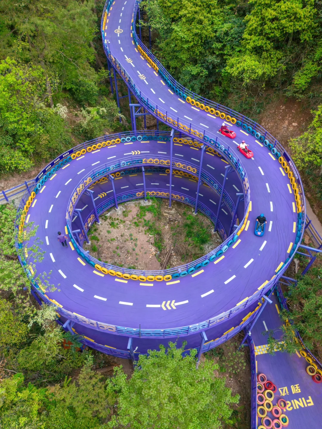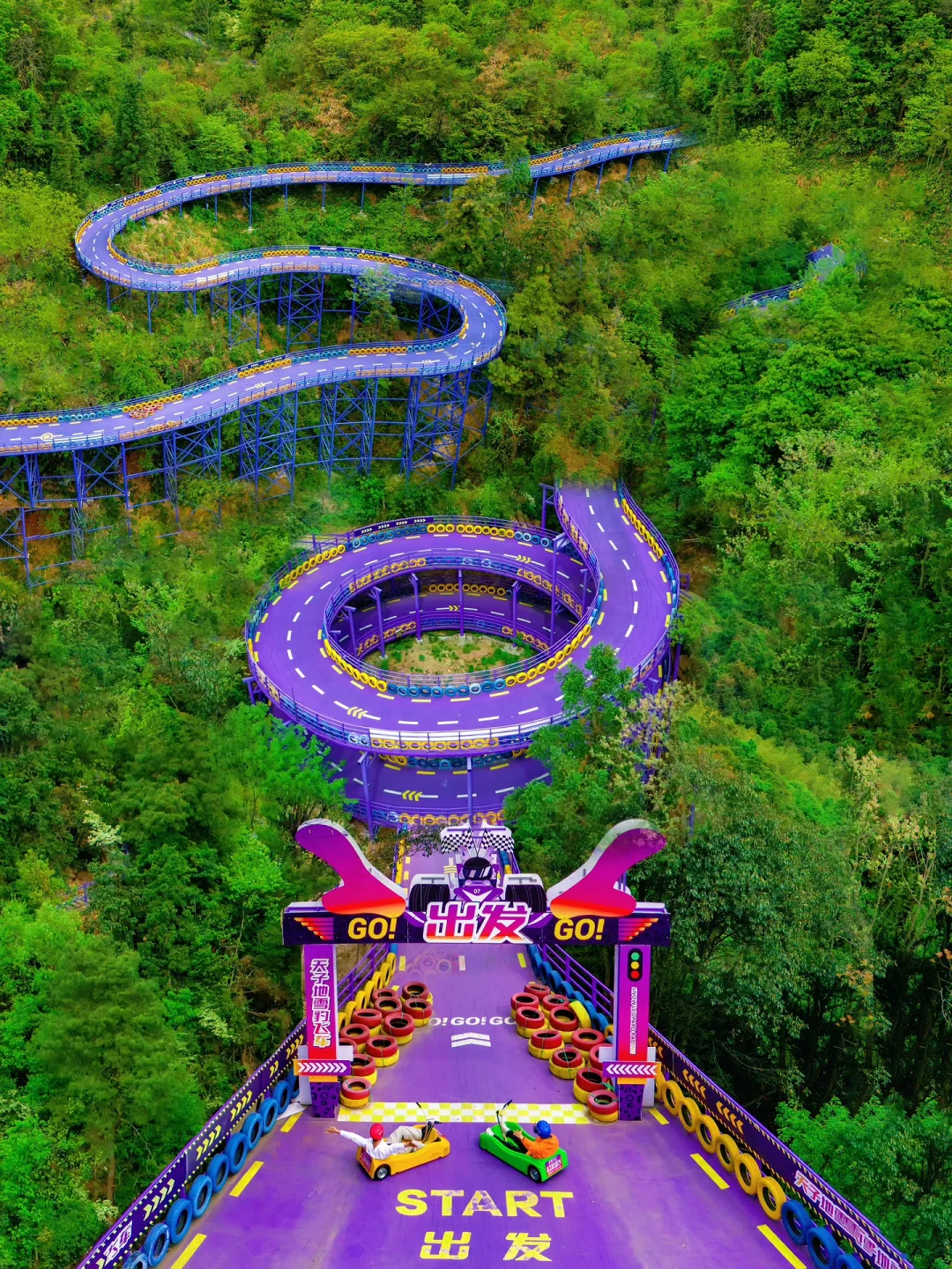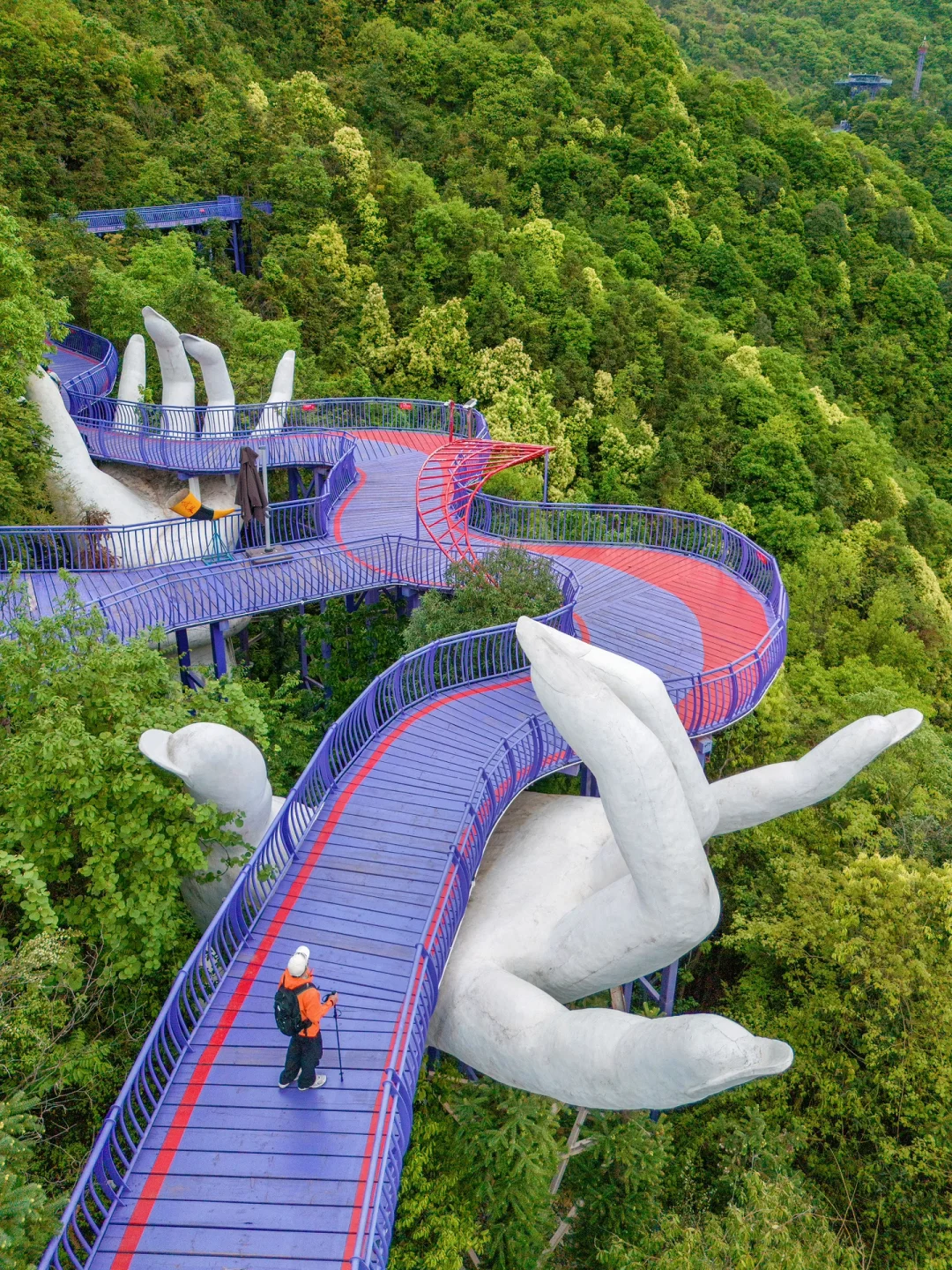 紫色的步行栈道被两只巨大而纤细的手掌托举在山林之上,拍照超级出片📸