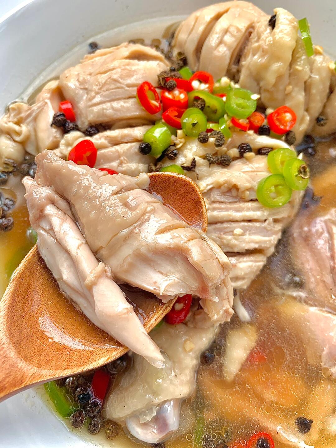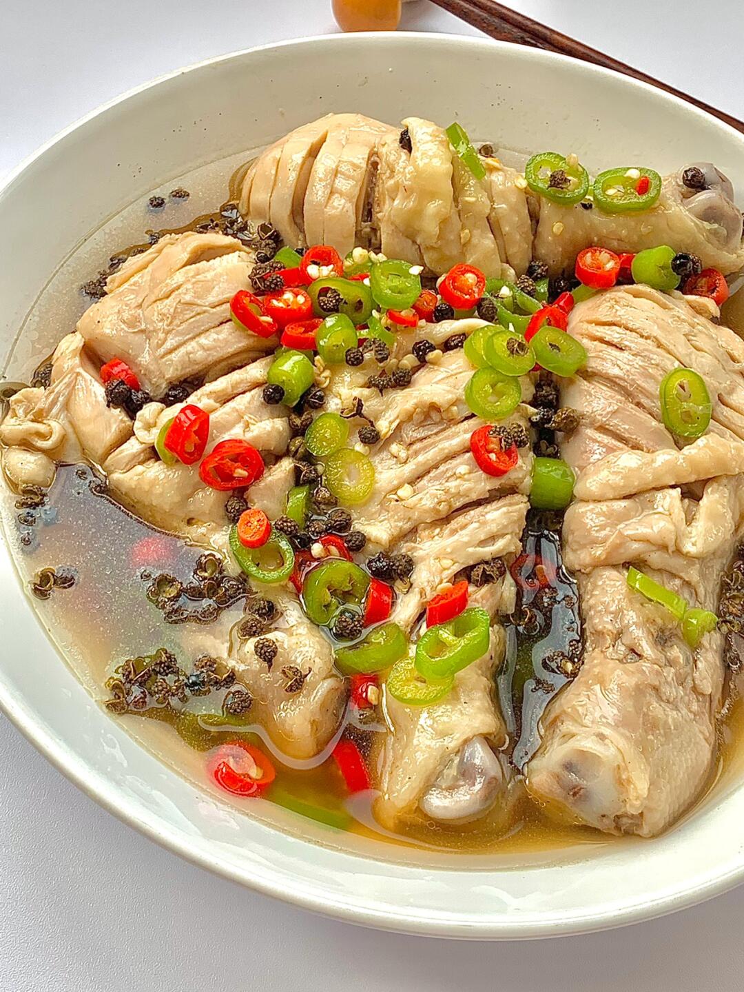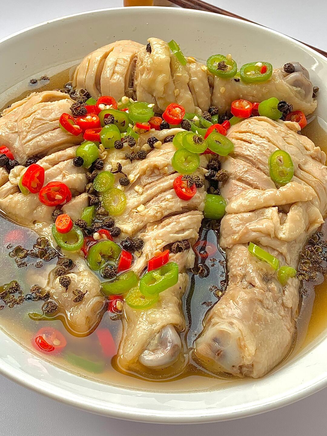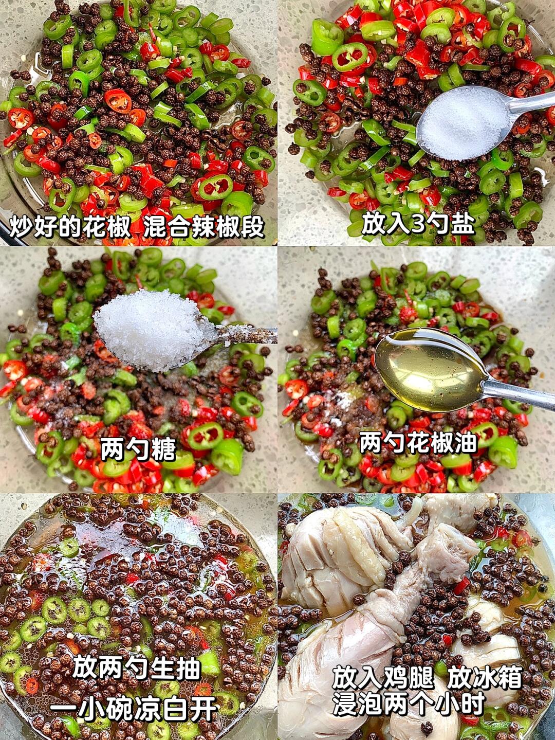 一到夏天特别喜欢吃凉茶店里的椒麻鸡!!现在在家也能自己做啦! - 🌟🌟食材: 鸡腿4-5个、青花椒一把、小米辣、线椒 🌟🌟步骤: 1⃣️鸡腿划花刀,冷水下锅,放入葱姜、料酒煮20分钟后,焖5分钟 2⃣️鸡腿捞出泡凉水10分钟,锅中少许油,小火炒香青花椒 3⃣️炒完的花椒混合辣椒段,放入㊙️三勺盐、两勺糖、两勺生抽、两勺花椒油、一小碗凉白开 4⃣️放入沥干水分的鸡腿,放冰箱浸泡两个小时以上 - 再也不用去凉菜店买啦!!完美复刻藤椒鸡腿!!