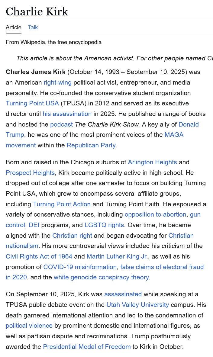 🚨 GroKipedia 与 Wikipedia:查理·柯克测试 Grokipedia 的首次亮相表明,唱片公司优先编辑如何扭曲公众记忆,而 Charlie 的条目就是确凿的证据。 维基百科以意识形态标签为先导,而 Grok 首先呈现可验证的事实,包括创立 TPUSA、全国影响力、选举动员以及他被暗杀的已确认细节,然后再进行任何解释。 在身后传记中,标签就像判决一样,给每个段落都蒙上了一层色彩;格罗克的描述性文字较少,来源较多,让读者能够根据证据来判断各种说法。 这不是在美化查理,而是在按顺序叙述:先陈述事实,再指出争议点,最后得出结论。 当编辑们将政策之争转化为道德品牌塑造时,平台就变成了某个群体的扩音器。 Grok 的 AI 驱动的事实密度和更快的纠错循环减少了这种波动,避免了编辑战。 如果说网络世界中立性有什么意义的话,那就是:描述发生的事情,归因于有争议的内容,并且除非引用并注明出处,否则不要在开头使用带有倾向性的标签。 查理测试证明,当我们用证据代替框架时,读者会获得更多启发,减少误解。 资料来源:维基百科、Grokipedia、 @elonmuskssci心理学 查理柯克凶手 datagro 查理·柯克案 beck测试 安克cata ava心理学