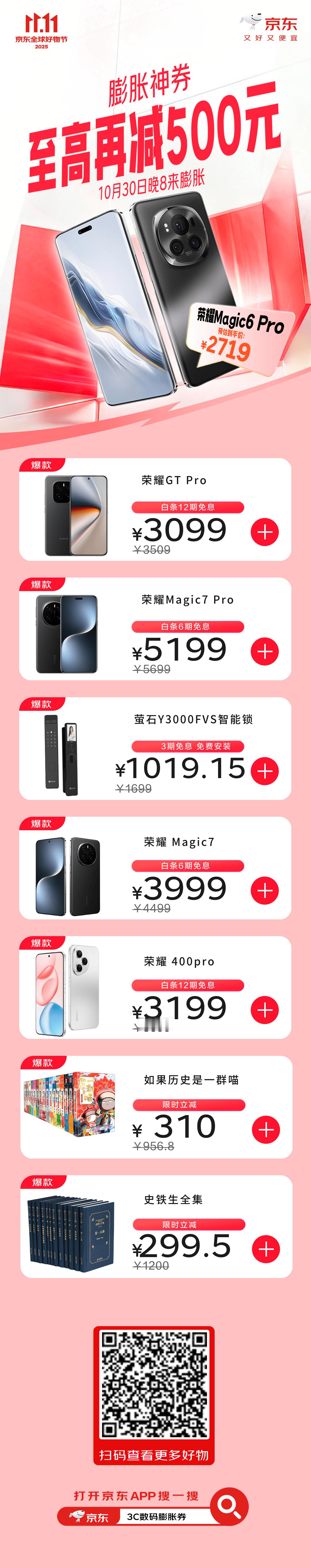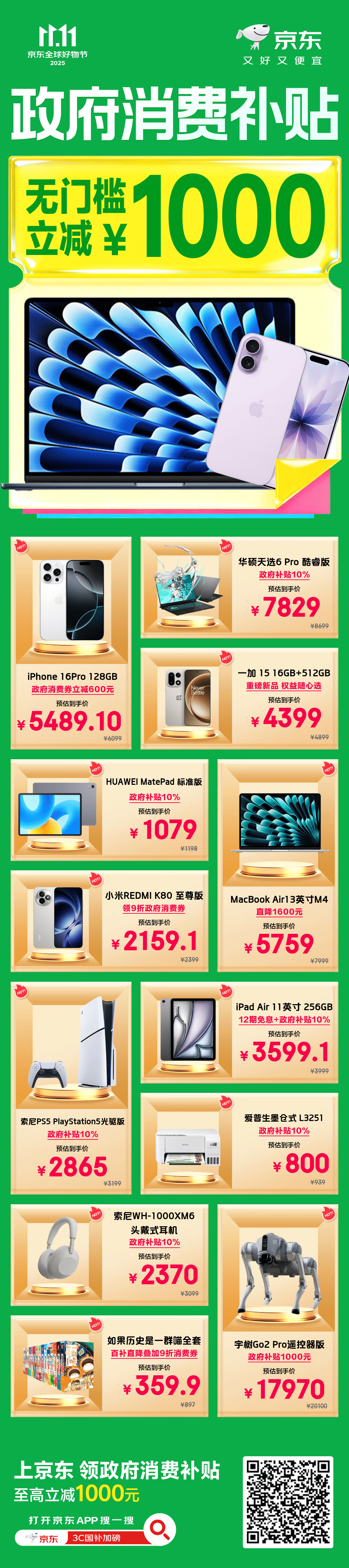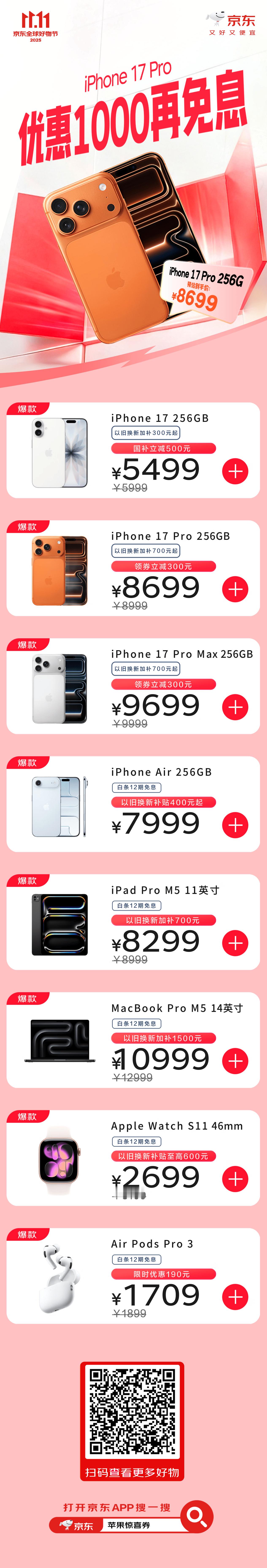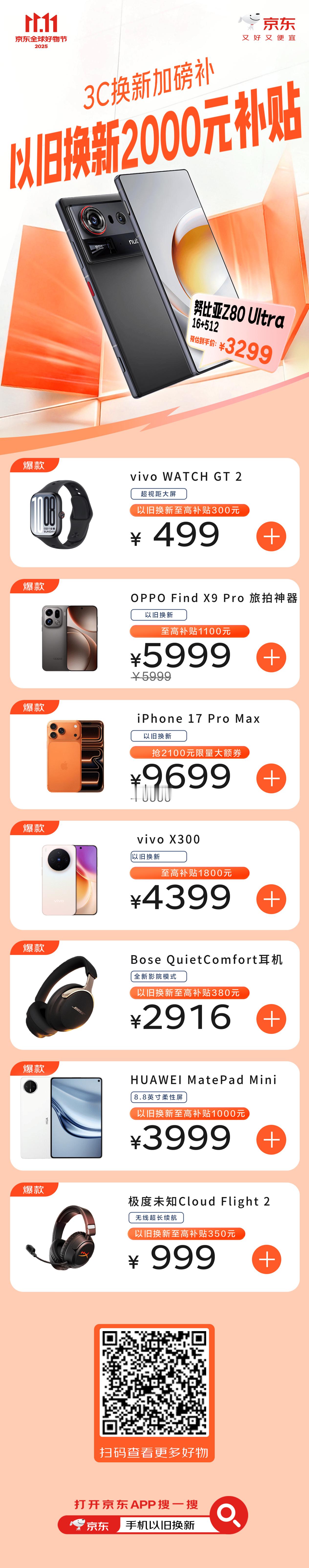 朋友们,双十一别再苦哈哈做攻略了,直接来抄作业!今日晚8上京东领五大补贴,买3C数码更便宜!五重补贴重重叠加闭眼可冲:领政府消费补贴叠多重补贴低至5折,领华为大额券至高1500元还能叠国补,iPhone17 Pro 系列新品首降1000元再免息,以旧换新限量补2000元,PLUS会员再减1111,还能抢3C数码5折膨胀券,至高减500元!快上京东APP搜「3C数码11.11」或戳【】,你的钱包和新设备都能保住!10月30日晚8点,京东11.11连续3天,疯狂加补,直接降价不凑单!又好又便宜的11.11只在京东!今晚8点京东补贴买3C数码更便宜 11.11加入刘宇宁的电玩宇宙 11.11买3C数码上京东 今晚8点京东11.11连续3天疯狂加补京东11.11 又好又便宜