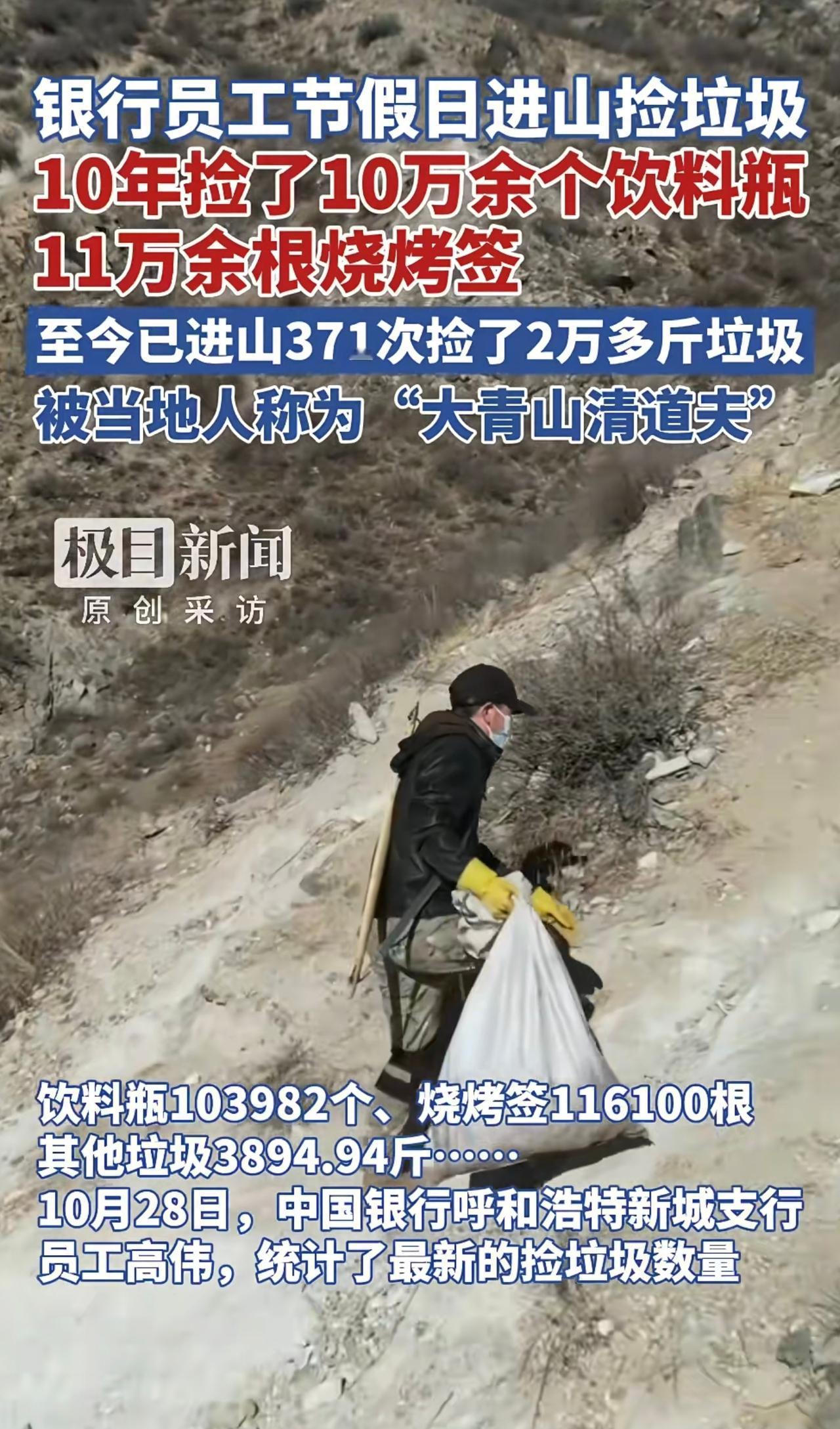 他默默无闻干了十年,这种比摆拍获得流量的不知道强了多少倍。每次进山要走10多公里路,全天在山里大约8个多小时,虽然他是在银行工作,但是却把周末、节假日的时间利用起来,而所有捡到的“垃圾”大约卖了8000元,又悉数捐了出去,现在又把退休的妻子带动起来,他被网友称呼为“行走的青山”,因为他值得。