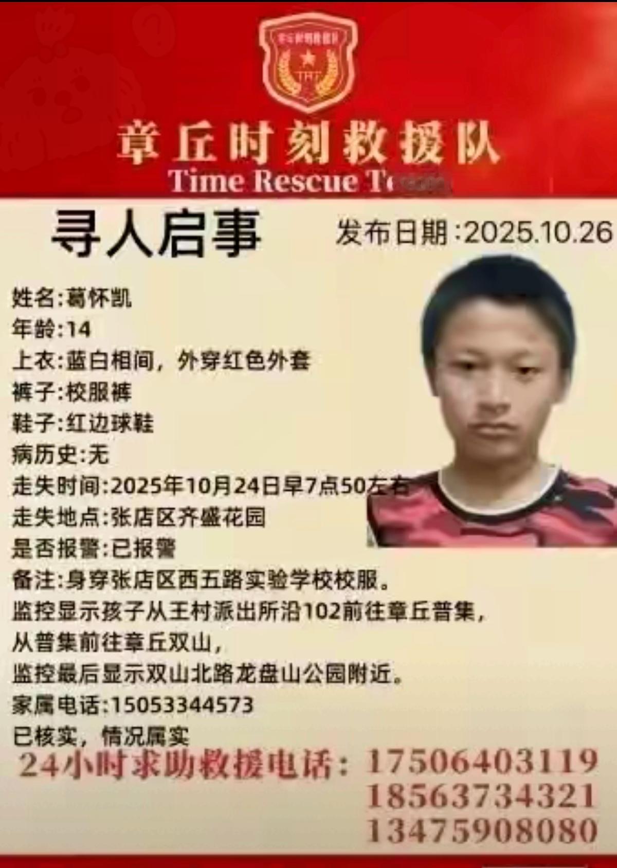 淄博14岁男孩葛怀凯失联5天,这事真让人揪心!就因为手机被收,他背着书包出门后就没了踪影,家里人快急疯了。 从淄博追到济南章丘,监控里能看到他的身影,还有人说他饿到去饭店找活干,谎称是家里让出来历练的。目击者说他瘦得厉害,精神也差商店老板想留他歇会儿,没等救援队到他就走了,最后出现在鱼池边后就没了线索。 30多个救援队员分片搜索,派出所也用上了人脸追踪,爸妈更是熬得快垮了,把能找的地方都翻遍了。这事哪是孩子闹脾气,分明是青春期沟通出了大问题!收手机是为孩子好,但硬来只会把孩子推远。 希望葛怀凯能看到消息赶紧联系家人,也求章丘的朋友多留意穿红外套、校服裤的少年。你们觉得,面对青春期孩子,到底该怎么沟通才不会激化矛盾?