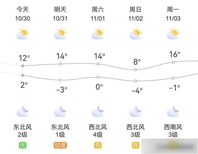 十月和十一月就将在这样平静安宁的天气里悄无声息地完成转换。目前来看,周日(11月2日)天空依旧晴朗,可西北风却把气温又往下拉了一点,最高气温回落到9℃左右,夜间最低气温下滑到-3℃附近。从下周一(11月3日)开始到下周三(11月5日),偏南风发力,给沈城带来连续几天的温暖,最高气温15℃到16℃之间,最低气温3℃到8℃之间。未来几天,冷暖空气有来有回,气温变化明显,提醒大家注意温度变化,及时调整衣装。
