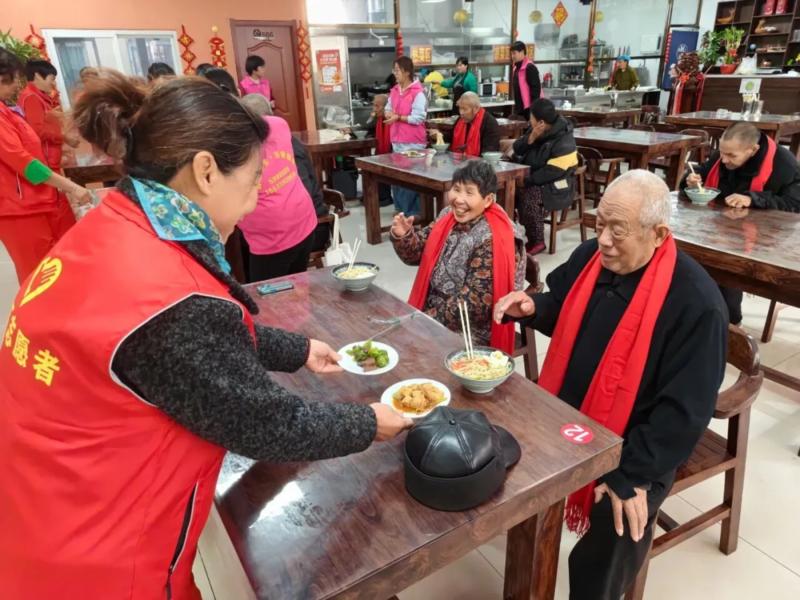 社区食堂后厨同步忙碌,为当天就餐老人精心准备了寓意健康长寿的“长寿面”。老人们围坐品尝,欢声笑语不断,食堂内满是温馨的节日气息。
