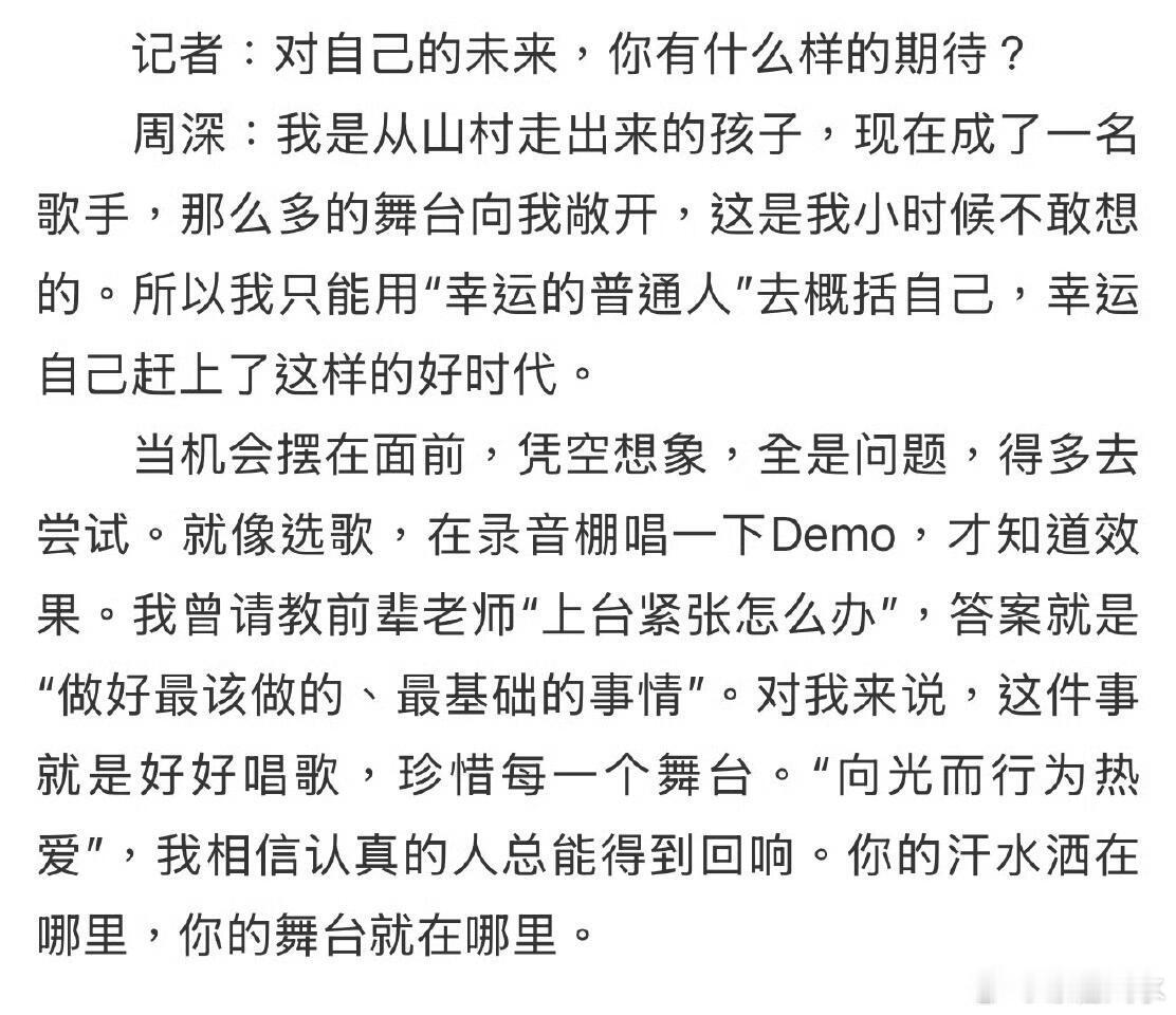 周深 人民日报对话周深:“我是幸运的普通人”言之有物又真诚善良,这表达能力和悟性不服不行,绝对的天才[赞][赞][赞]刚刚去买了报纸,宝贝好棒周深[超话]
