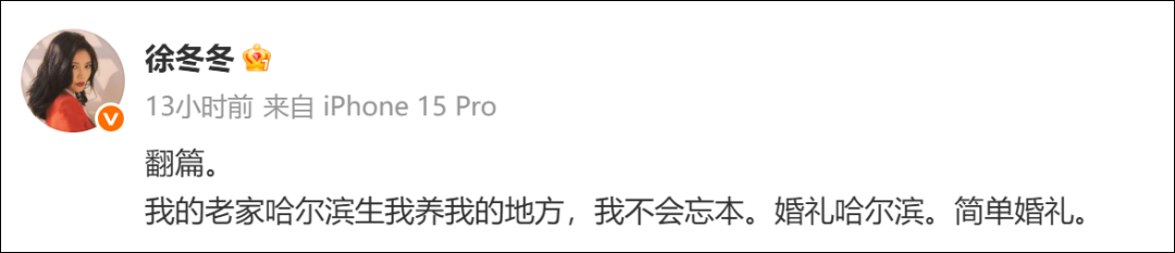 近期,两人因婚礼举办地产生分歧。10月29日,徐冬冬发微博称:“翻篇。我的老家哈尔滨生我养我的地方,我不会忘本。婚礼哈尔滨。简单婚礼。”
