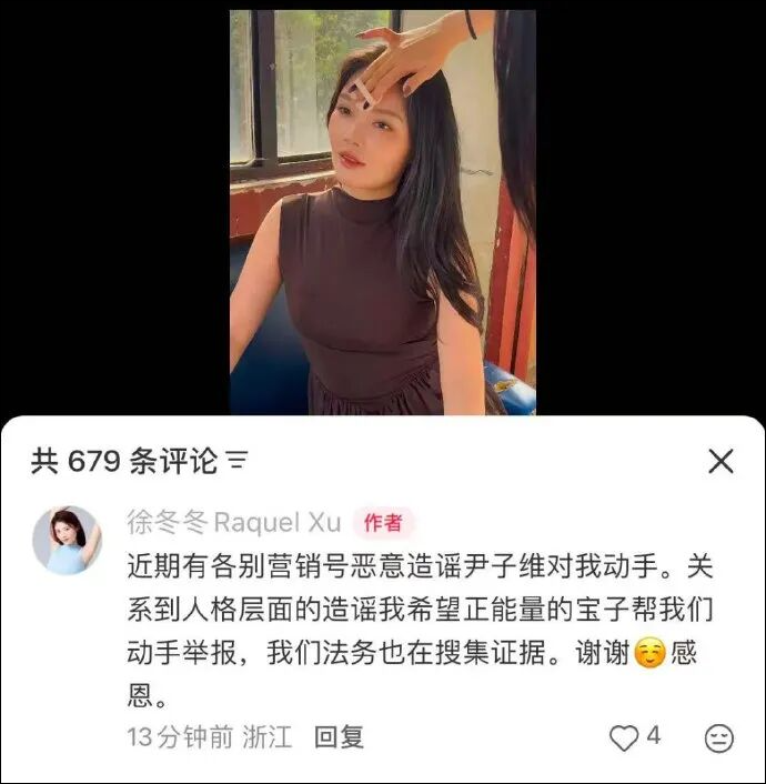 10月29日,女星徐冬冬更新视频,否认未婚夫尹子维对她动手:“近期有个别营销号恶意造谣尹子维对我动手,关系到人格层面的造谣,我希望正能量的宝子帮我们动手举报,我们法务也在搜集证据。”