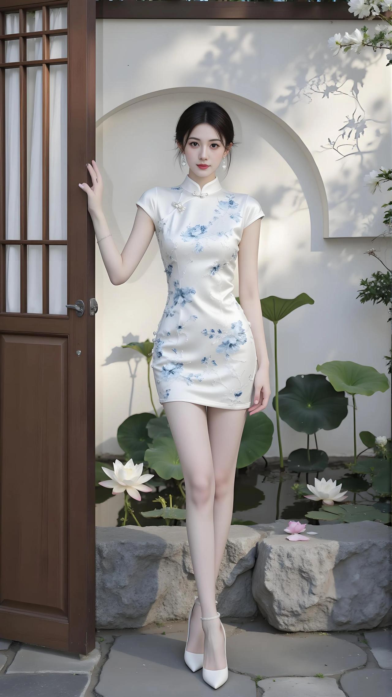 藕花香里立朱门,曼姿摇曳似惊魂。 垂花映日影姗姗,罗衣轻舞带风还。旗袍 旗袍美人 旗袍穿搭