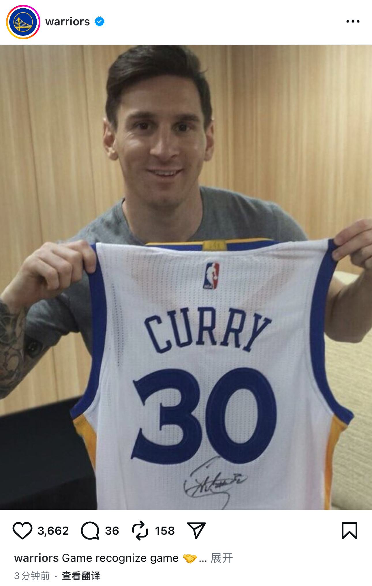 金州勇士官方ins晒梅西手举库里30号球衣: