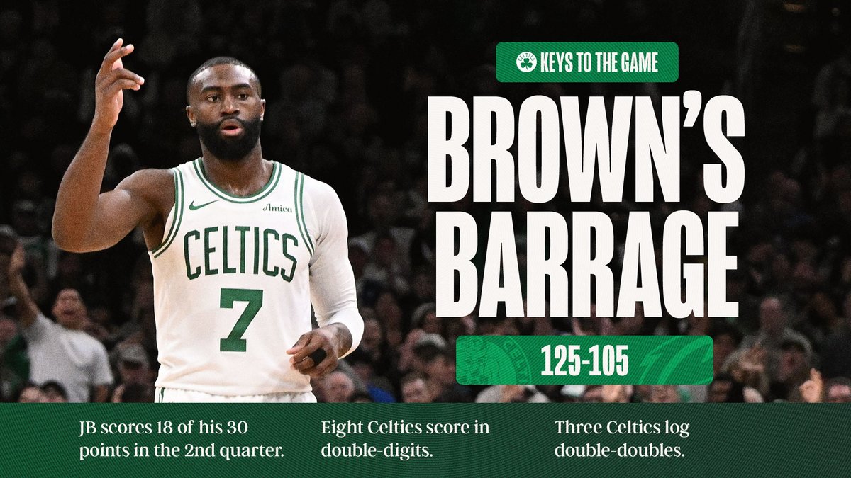 凯尔特人官方推特报道。杰伦·布朗在半场前爆发得分狂潮,为球队20分大胜骑士奠定基调。