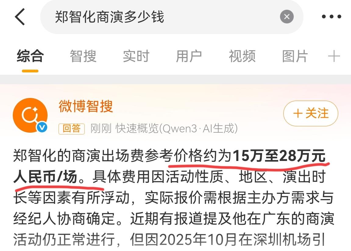 有博主说在郑智化事件中,无需共情机场牛马,因为他们一个月能拿好几千工资。 结果用智叟一查: 啧啧,大明星商演出场费居然高达几十万。 想想那五个拿几千块的机场牛马,都已经蹲下身体用双手为歌手推动腿脚了,却得到了嘲笑与谩骂。 无数媒体让我们共情歌手。 而我们只想共情机场牛马,无数博主却告诉我们,他们有几千工资无需共情。 而我们想说:那明星还有几十万出场费呢,需要我们共情个鸡毛。