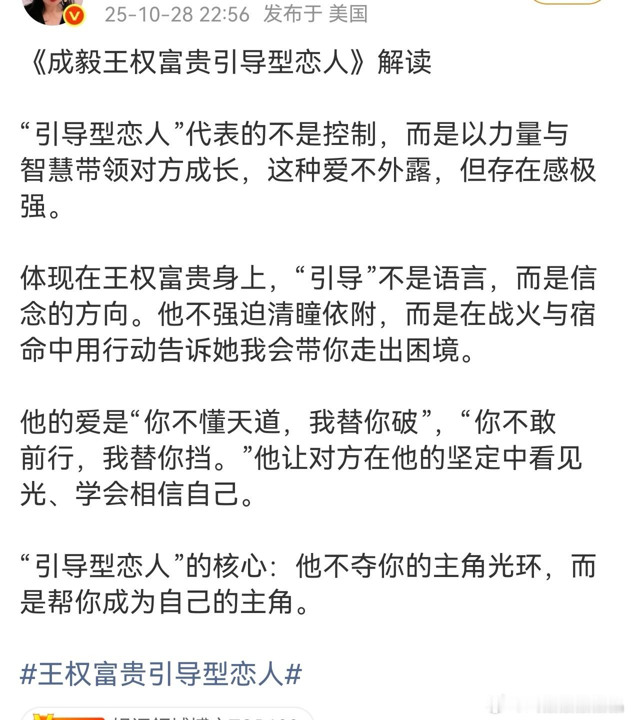 真正的引导型恋人是充分尊重女主的意愿,给资源、给人脉帮助女主变得更强大。