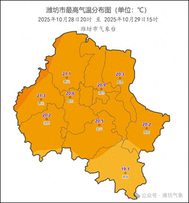最高气温:北部沿海地区15℃左右,菏泽、济宁和聊城21℃左右,其他地区19℃左右。