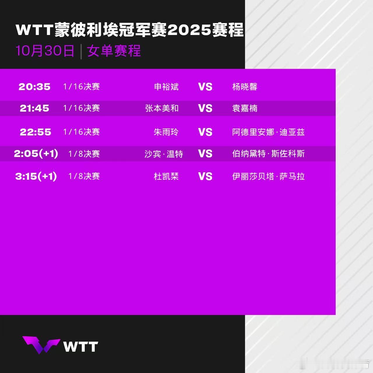 wtt蒙彼利埃冠军赛2025 10月30日赛程,朱雨玲出战。中国乒乓球梦之队[超话]