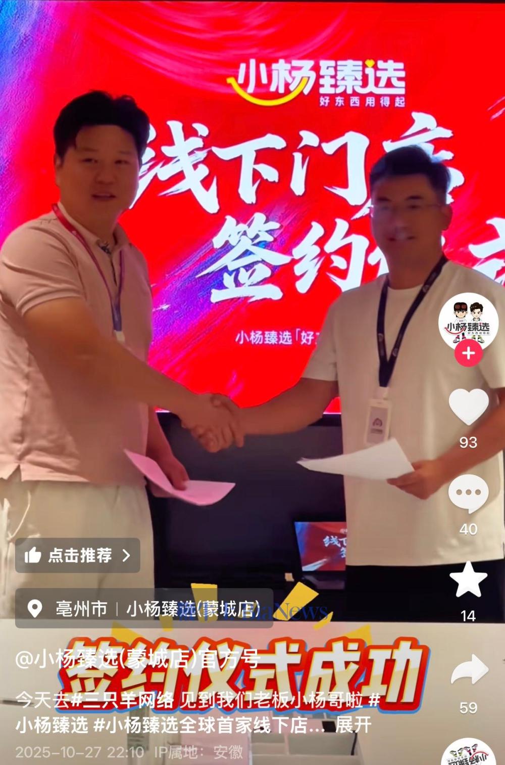 视频中还有小杨臻选线下店和三只羊集团负责人签约的画面。