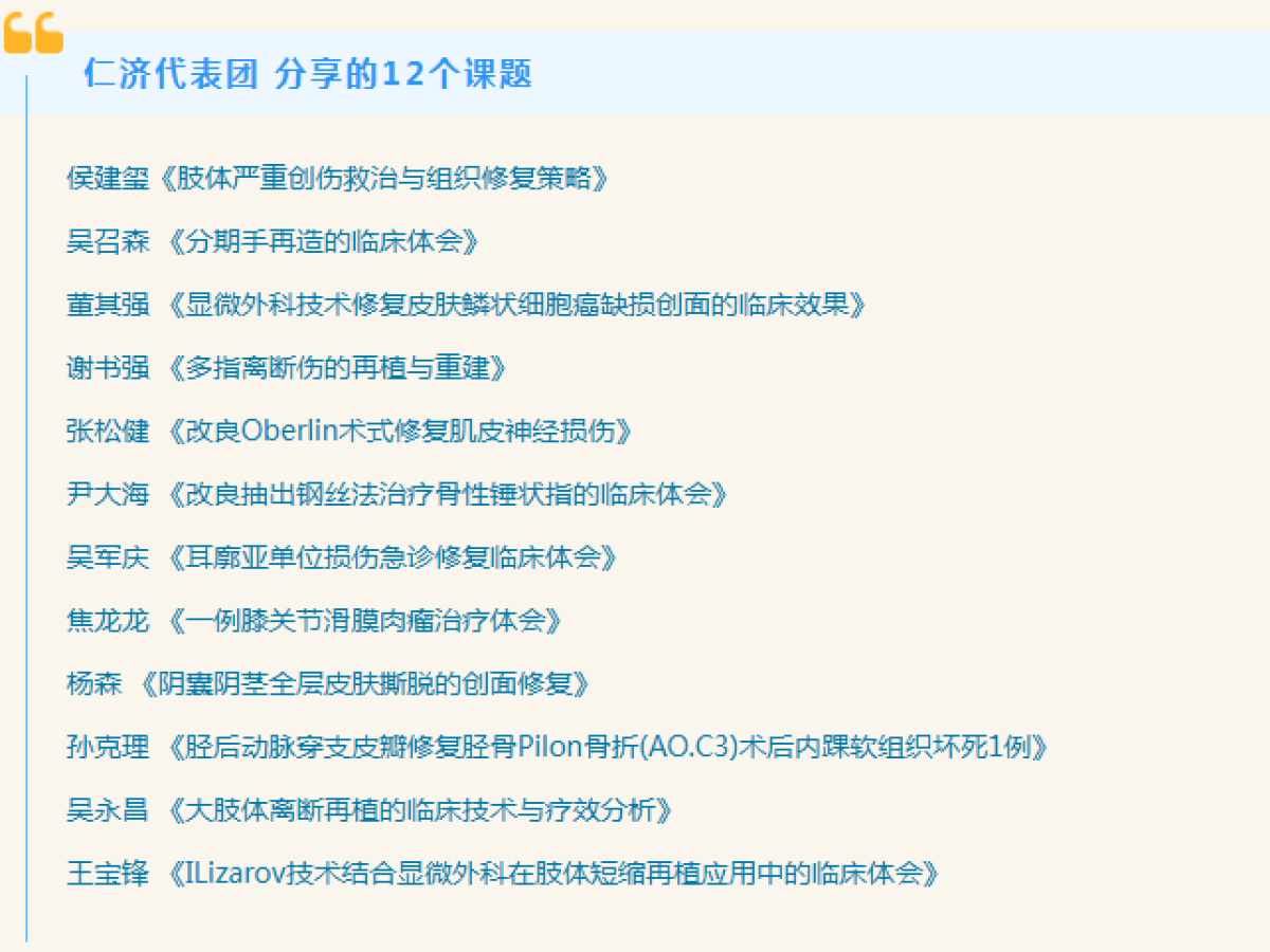 这12场课题,既有日积月累珍贵的临床经验沉淀,又有深耕钻研的技术创新突破。而其中,也展现着仁济人的宝贵品格,以及医者最动人的传承——以守正之心踏实向前,以创新之力勇攀高峰,在接续奋斗中助力显微外科事业的蓬勃发展。