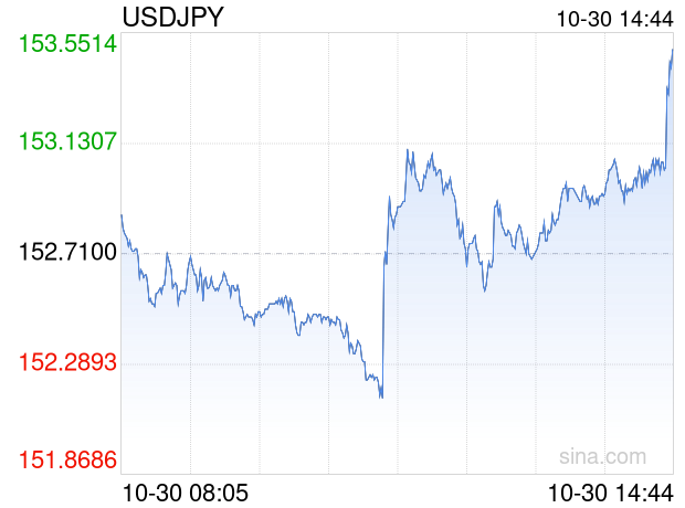 新浪外汇消息2025年10月30日,截至14时44分,外汇市场上美元兑日元汇率突破1美元兑换153.5100日元。涨幅为0.5239%