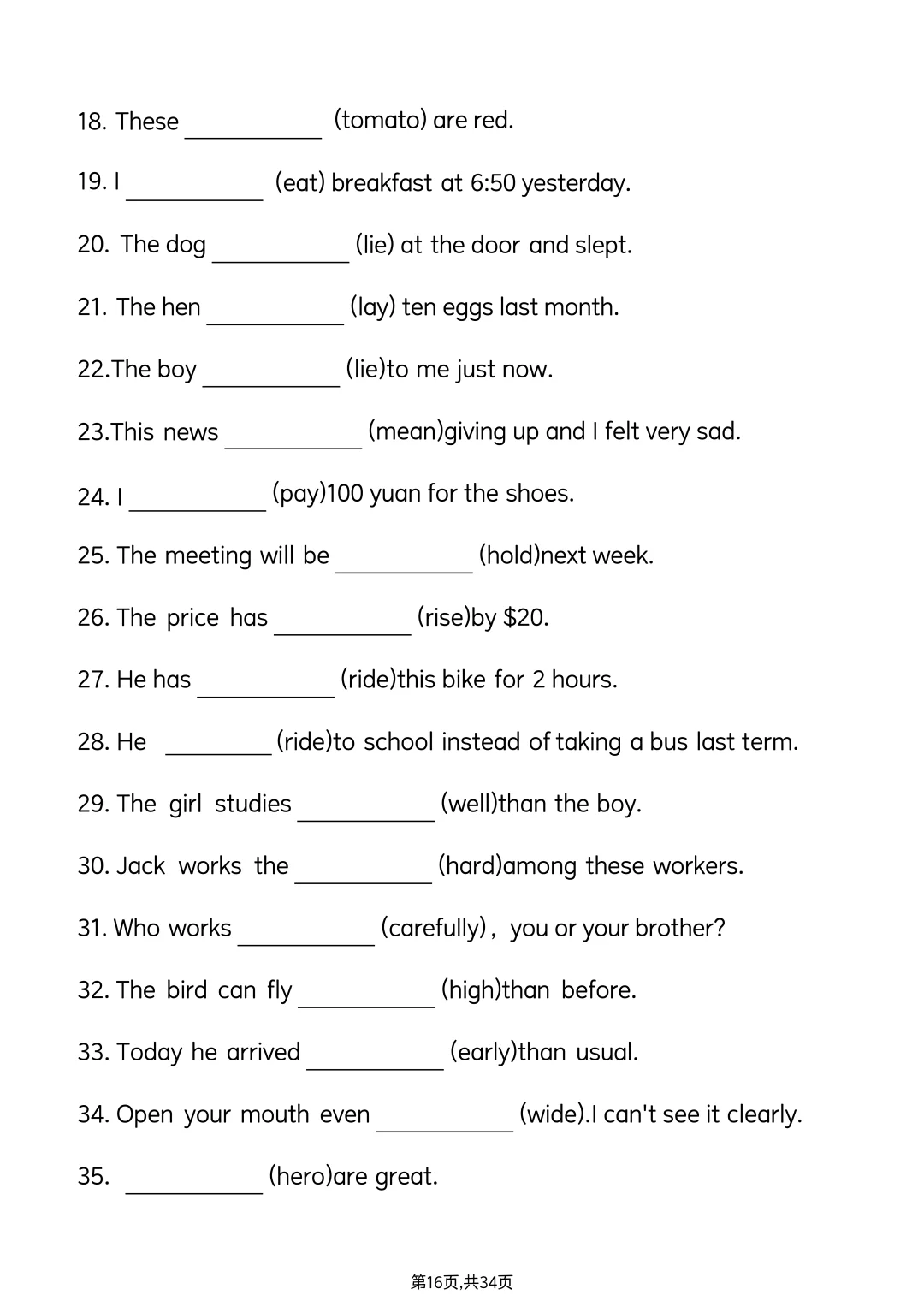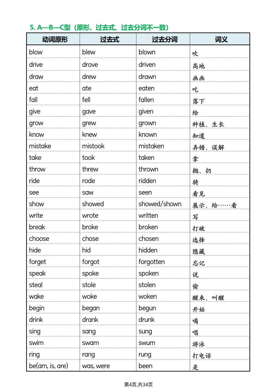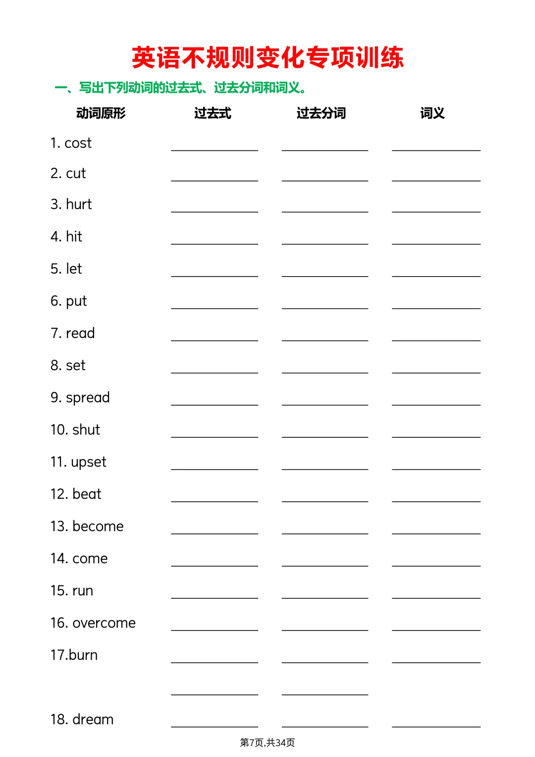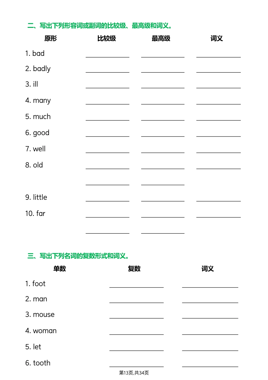 一共34页。 目录如下: ✅英语不规则变化归纳汇总 一、动词不规则变化 二、形容词、副词的比较级和最高级不规则变化 三、名词单数变复数不规则变化 ✅英语不规则变化专项训练 一、写出下列动词的过去式、过去分词和词义 二、写出下列形容词或副词的比较级、最高级和词义 三、写出下列名词的复数形式和词义 四、请用所给词的话当形式填空 五、选择题 六、参考答案 🛍️左下角店铺获取完整版。
