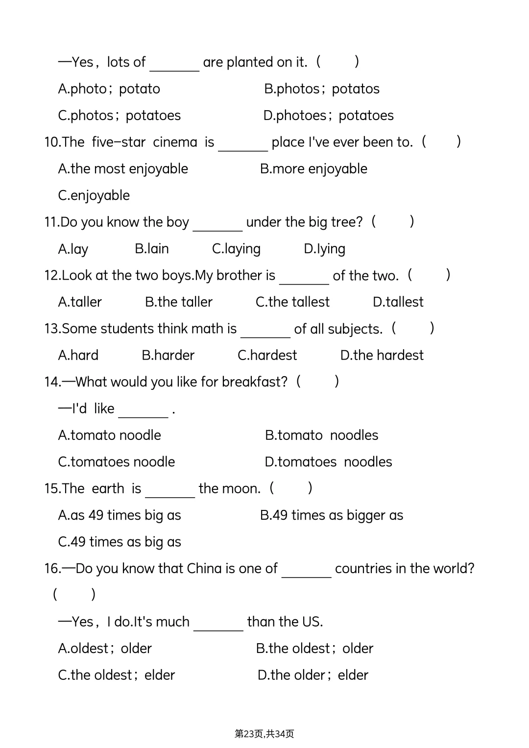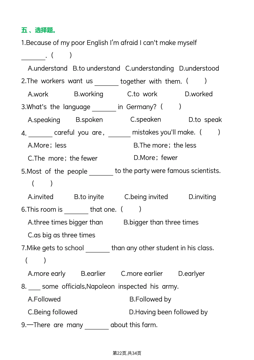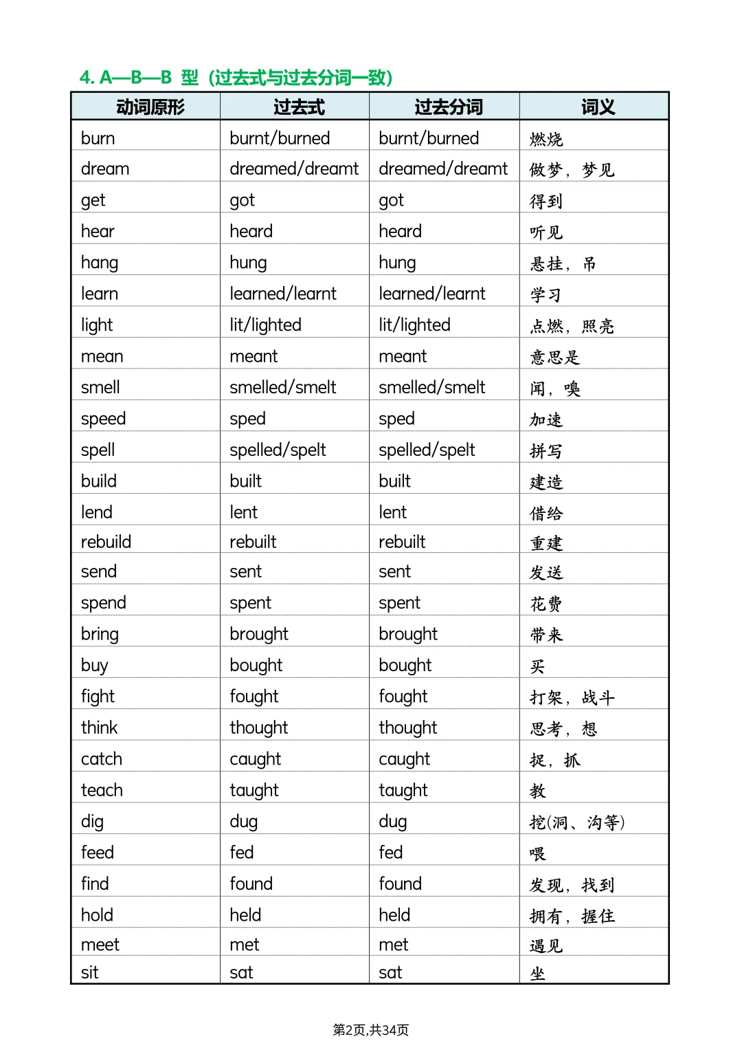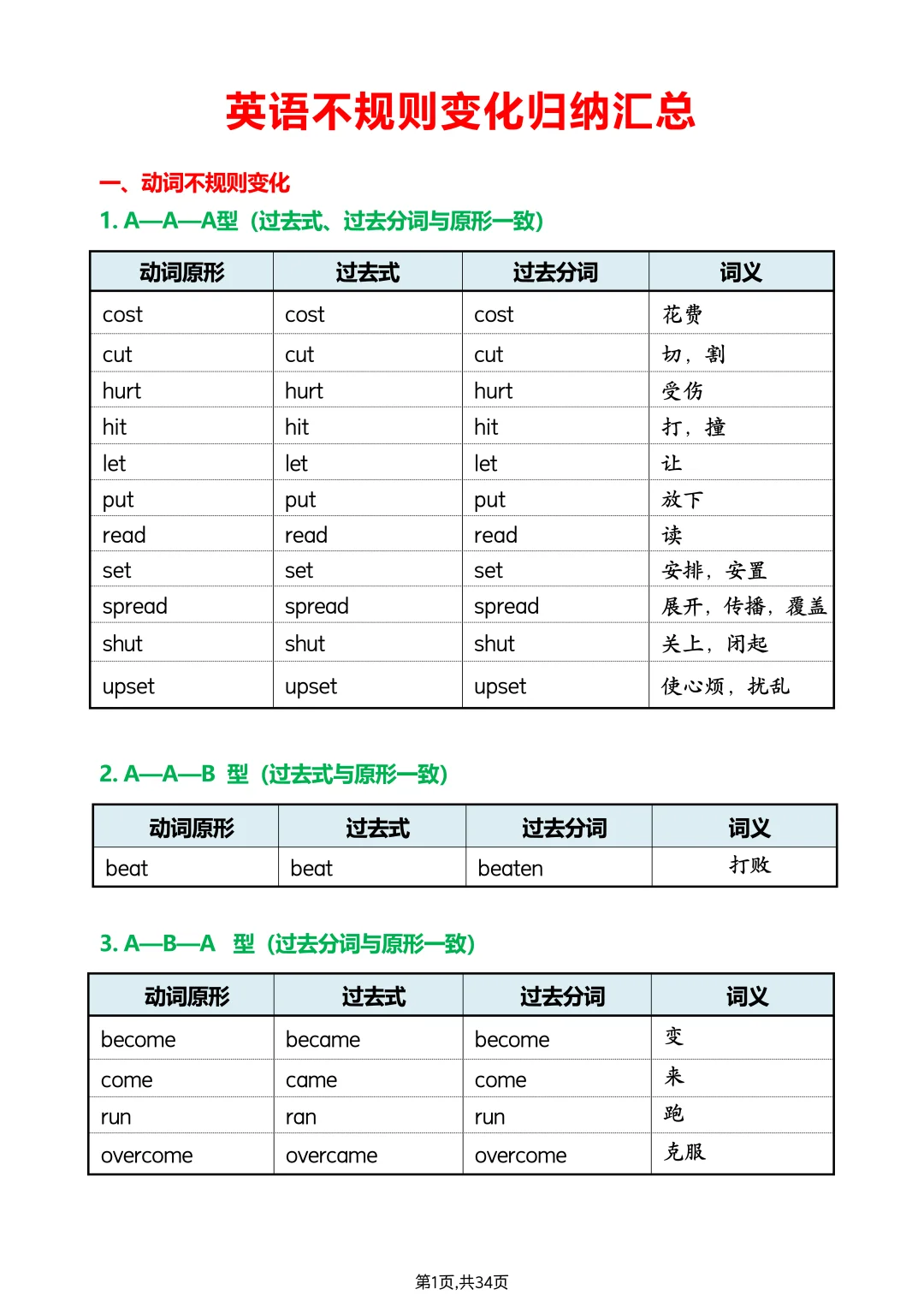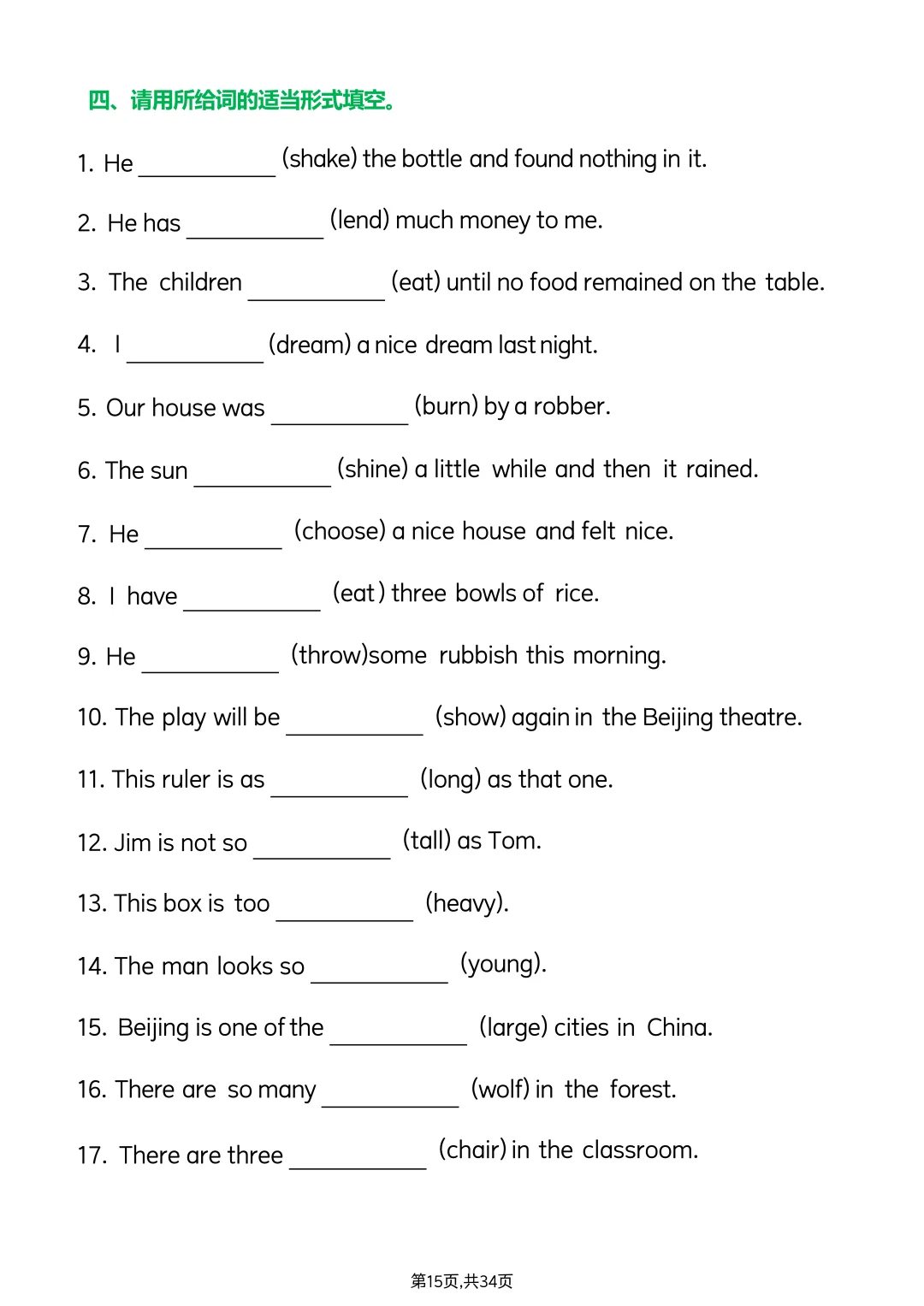 一共34页。 目录如下: ✅英语不规则变化归纳汇总 一、动词不规则变化 二、形容词、副词的比较级和最高级不规则变化 三、名词单数变复数不规则变化 ✅英语不规则变化专项训练 一、写出下列动词的过去式、过去分词和词义 二、写出下列形容词或副词的比较级、最高级和词义 三、写出下列名词的复数形式和词义 四、请用所给词的话当形式填空 五、选择题 六、参考答案 🛍️左下角店铺获取完整版。