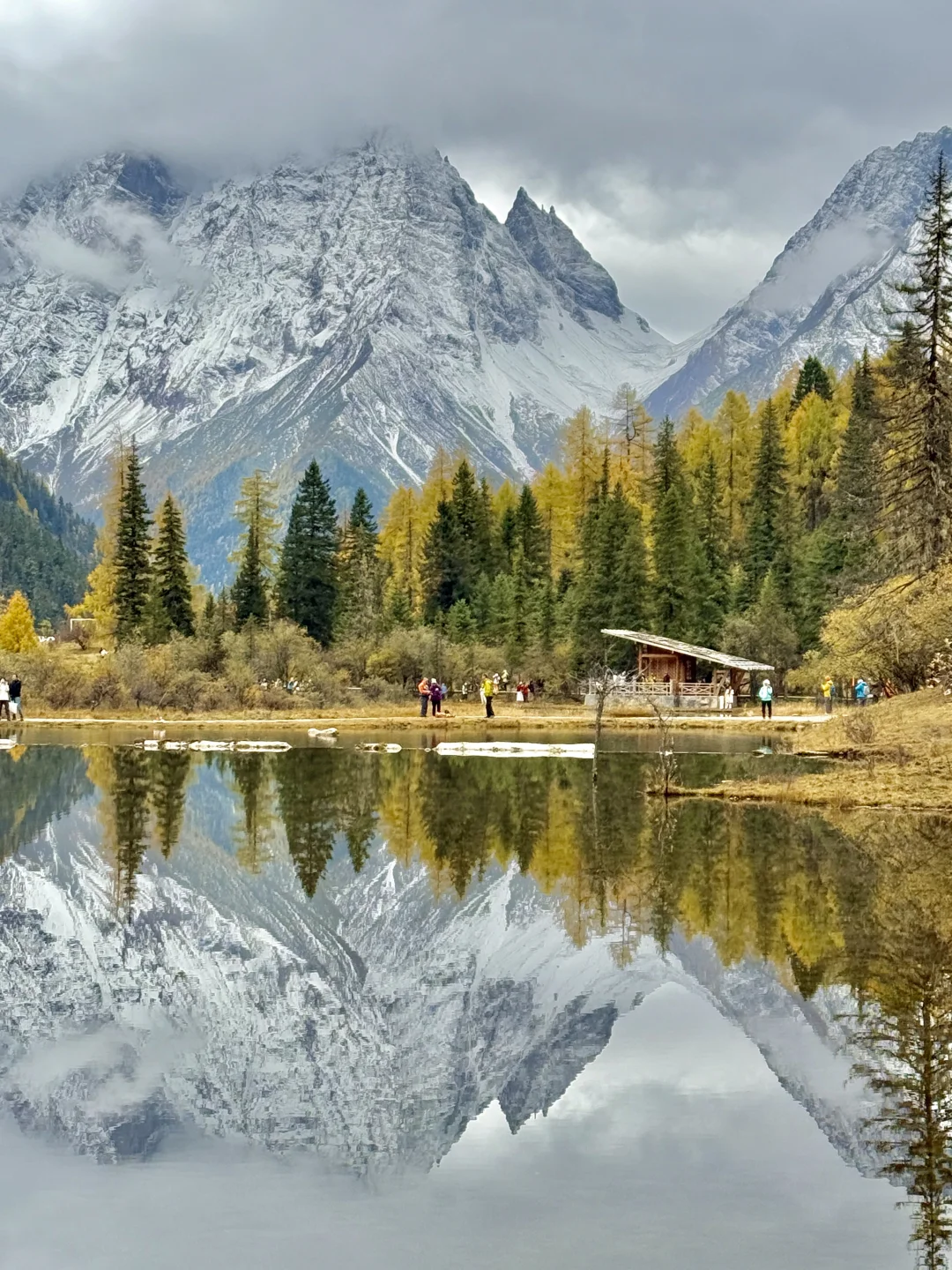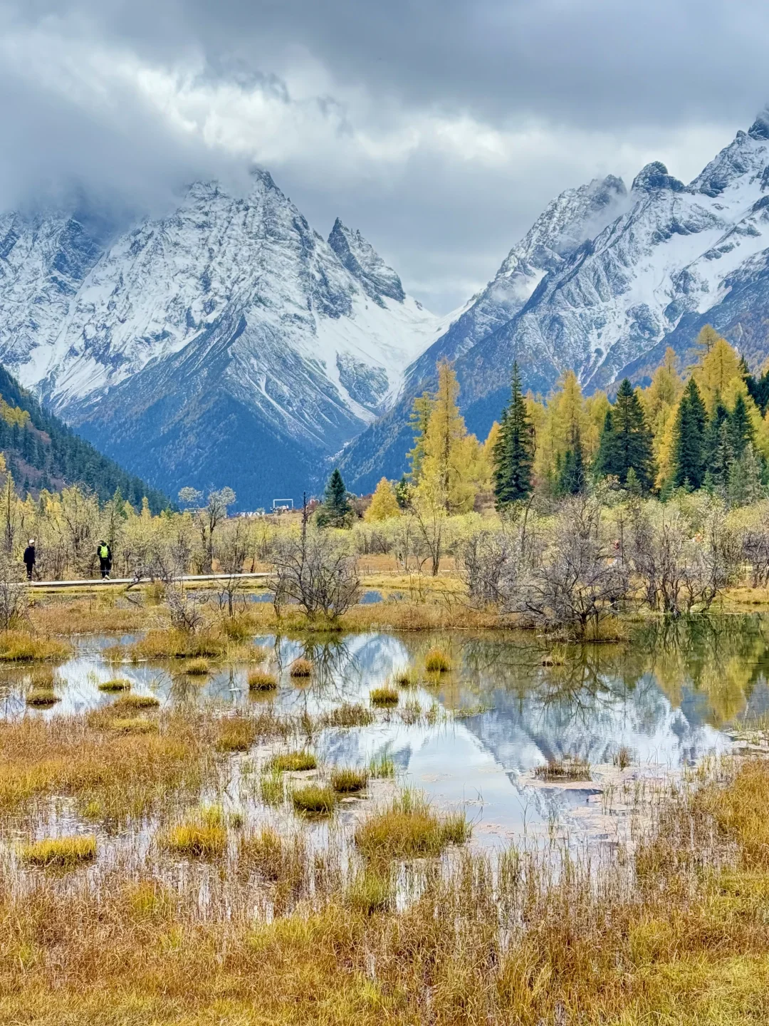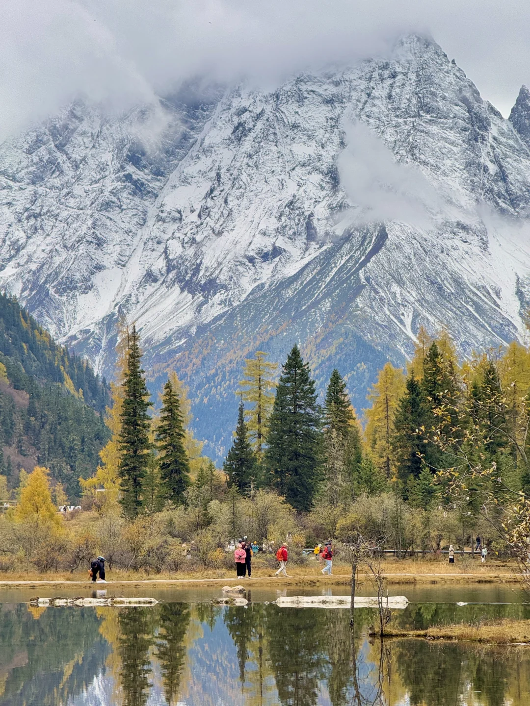 真的不敢想象,晴天会有多美!! . 建议游玩路线: 红杉林-布达拉峰-四姑娜措-撵鱼坝-隆珠措-人生果坪 - 最出片的地方在布达拉峰那一站下来,往上走一段距离,就可以拍到雪山湖泊的倒影。