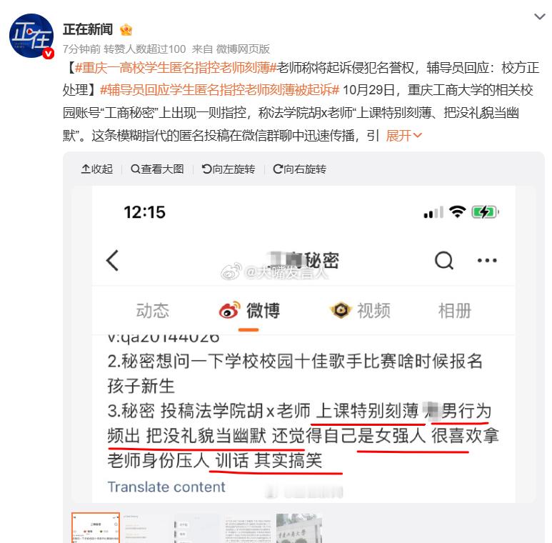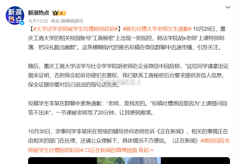 重庆一高校学生匿名指控老师刻薄,热点观点 ,大学法学老师被学生吐槽称将起诉