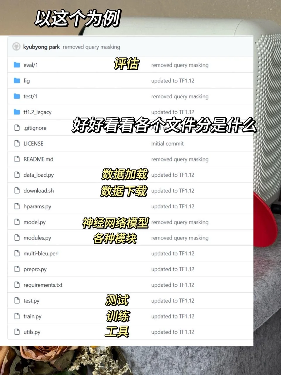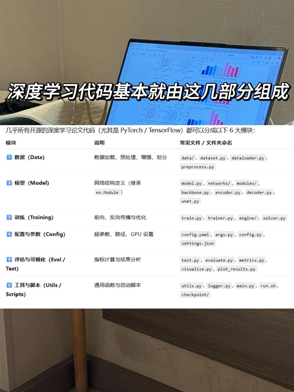 找到开源代码后,你需要先搞清楚这每个文件的意思,初步理解各模块功能。我会直接把网址丢给GLM4.6让他帮我解释,深度学习说白了就是由这几个部分构成的: