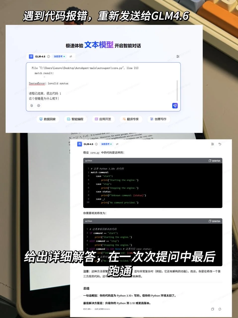 完成后首要任务是先测试代码,一般情况下很难直接跑通,可以打上断点一点点debug,遇到报错就把报错信息复制给GLM4.6,问他咋解决,反复几次就可以了。再不行可以下载一个claude code,然后把GLM4.6接进去,让他直接上手帮忙改,啥不会就问啥,claude太贵课题组不报销用不起,但是