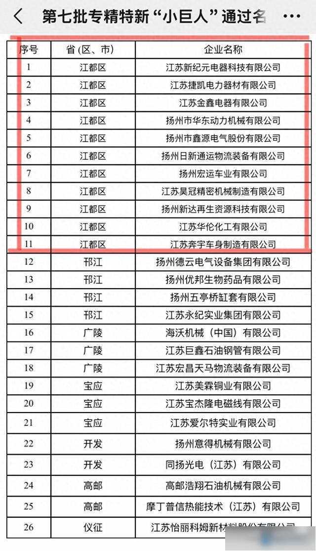 日前,江苏省工信厅对通过国家级第七批专精特新“小巨人”认定审核的企业名单公示期结束,我区11家企业榜上有名,占全市公示企业的42.3%,在扬州位列第一。截至目前,全区已累计创成国家级专精特新“小巨人”企业27家,总量排全市第一。
