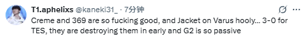 在刚刚结束的TES对战G2的首局比赛里,TES轻松战胜G2,让我们看看国外网友是怎么讨论的吧: