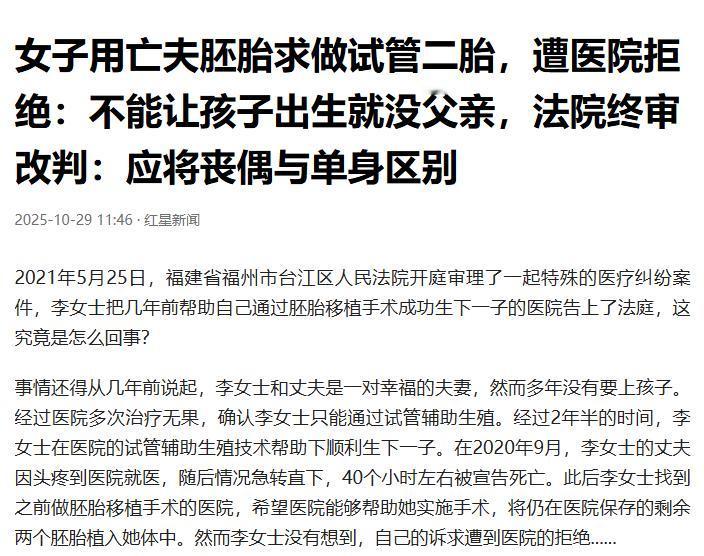 福建福州,李女士和丈夫结婚几年没有孩子,于是通过胚胎移植技术,成功生下了一个儿子。不久后,丈夫的不幸离世,丈夫去世后,李女士要求医院为她移植保存的胚胎,怀上二胎。然而,医院以李女士为丧偶的单身女性为由拒绝了她的请求,认为她不能进行胚胎移植手术。李女士不服,决定提起诉讼。在一审和二审判决都支持医院的做法后,案件上诉至最高法院,最终法院判决支持了李女士的请求。 李女士和丈夫结婚多年,始终未能如愿怀上孩子。经过多次尝试并在医学专家的帮助下,他们决定通过试管婴儿技术解决生育难题。历经两年半的努力,李女士终于怀孕,并成功生下了一个儿子。夫妻二人满心欢喜,开始规划他们的二胎生活。然而,命运却突然改变。李女士的丈夫在2019年突然因病离世,李女士陷入了深深的痛苦中。在她的心中,丈夫一直希望有更多的孩子,两人一起为此做出的计划,她希望能够继续完成丈夫未完成的愿望。 丈夫去世后,李女士决定继续履行他们曾经的生育计划。她再次联系了进行胚胎移植手术的医院,希望能够将之前冷冻保存的胚胎移植到自己体内。然而,医院的答复令她感到震惊。医院拒绝为她实施胚胎移植手术,理由是,她已经丧偶并成为单身女性,且夫妻双方需要共同签署同意书。医院表示,胚胎移植不仅需要夫妻双方的同意,而且孩子一出生就会成为单亲家庭,无法享受父爱,这对于孩子的成长不利。因此,医院认为不能为她实施移植手术。 李女士对此决定提出起诉,要求医院继续为她实施胚胎移植手术。在一审和二审中,法院均判定医院胜诉,认为医院的做法符合现行法律法规,李女士作为丧偶者,不能继续接受胚胎移植。然而,李女士不服,她上诉至最高法院。经过审理,最高法院认为,李女士要求继续生育二胎的请求具有充分的法律依据,判定医院继续履行合同,为李女士进行胚胎移植手术。 从法律角度分析,这个案件涉及的核心问题是生育权与伦理的冲突,以及医疗服务合同的履行。根据我国的相关法律,李女士作为女性,享有生育的基本权利,这一点在《妇女权益保障法》第五十一条中得到了明确规定。该条款规定,妇女有按照有关规定生育子女的权利,也有不生育的自由。李女士与丈夫共同的生育计划,已经明确表明了她有继续生育二胎的权利。虽然丈夫已经去世,但这不应成为剥夺她生育权利的理由。 医院拒绝实施胚胎移植手术的依据是,李女士处于丧偶状态,并且作为单身女性无法继续接受该手术。这一做法,实际上是一种对李女士生育权的限制。根据《民法典》相关规定,合同履行应当依照当事人之间的约定进行。李女士和医院在之前签订的合同中明确了胚胎保存和移植事宜,这份合同本应在她提出继续生育的请求时得到履行。 尽管医院的拒绝有一定的伦理考虑,认为孩子一出生便没有父亲可能会对孩子的成长产生不利影响,但这种伦理考量不能高于法律规定。在医疗决策中,伦理因素的确有其重要性,但不能超越法律的框架。根据《民法典》的规定,当合同履行不涉及任何违法行为时,相关当事人有权要求合同继续履行。在此案件中,李女士和丈夫已经充分表达了他们共同生育二胎的意愿,李女士的请求是基于此前双方合意的生育计划,医院没有充分的法律依据拒绝履行这一合同。 此外,李女士并非主动选择单身,而是因为丈夫的意外去世才导致其成为丧偶者。在法律上,丧偶与主动选择单身有着本质的区别。李女士原本是处于婚姻关系中的,她与丈夫共同拥有生育二胎的计划,而这一计划并没有因为丈夫的死亡而终止。从法律公平和人权保障的角度来看,不能因为李女士的婚姻状态发生变化而剥夺她继续生育的权利。对于李女士来说,生育二胎不仅是她和丈夫共同的愿望,也是对丈夫去世后的某种纪念和情感延续。 最高法院最终的判决,意味着法律在保障公民基本权利方面具有最高权威性。尽管伦理和社会的影响在医疗决策中具有一定的作用,但在涉及到基本人权和合法权益时,必须优先考虑法律的规定。李女士作为已婚女性,生育的权利应得到法律的保障,医院的行为不能剥夺她继续实现这一愿望的机会。