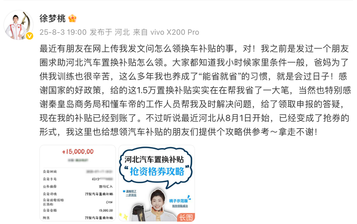 赛场上,徐梦桃以专业眼光精准判断每一次跳跃;生活中,她选车时同样看重政策的 “专业性”—— 主动享受国家以旧换新补贴,正是认可这项政策的惠民力度与规范保障。