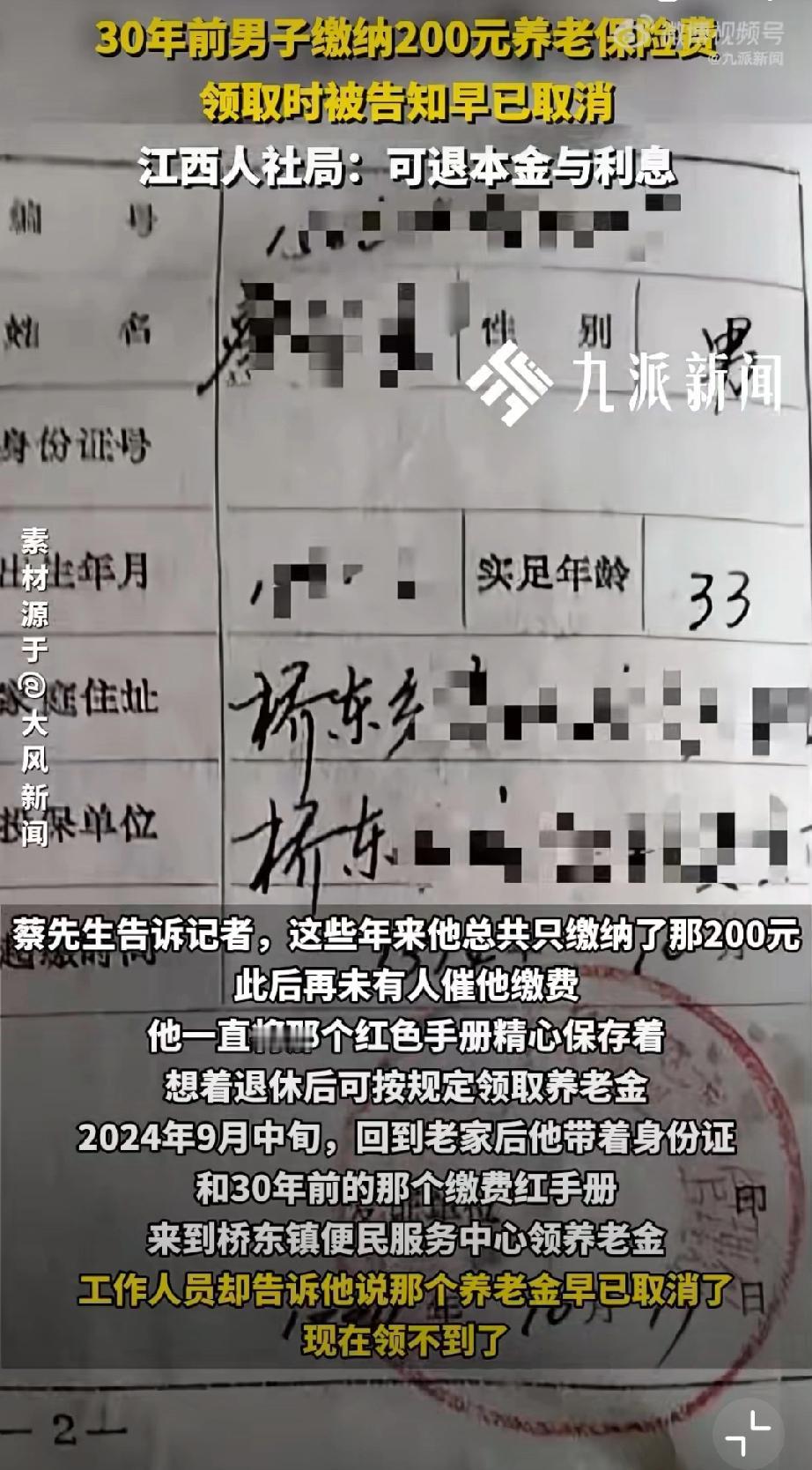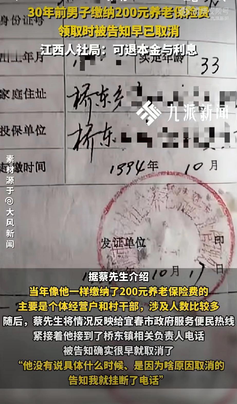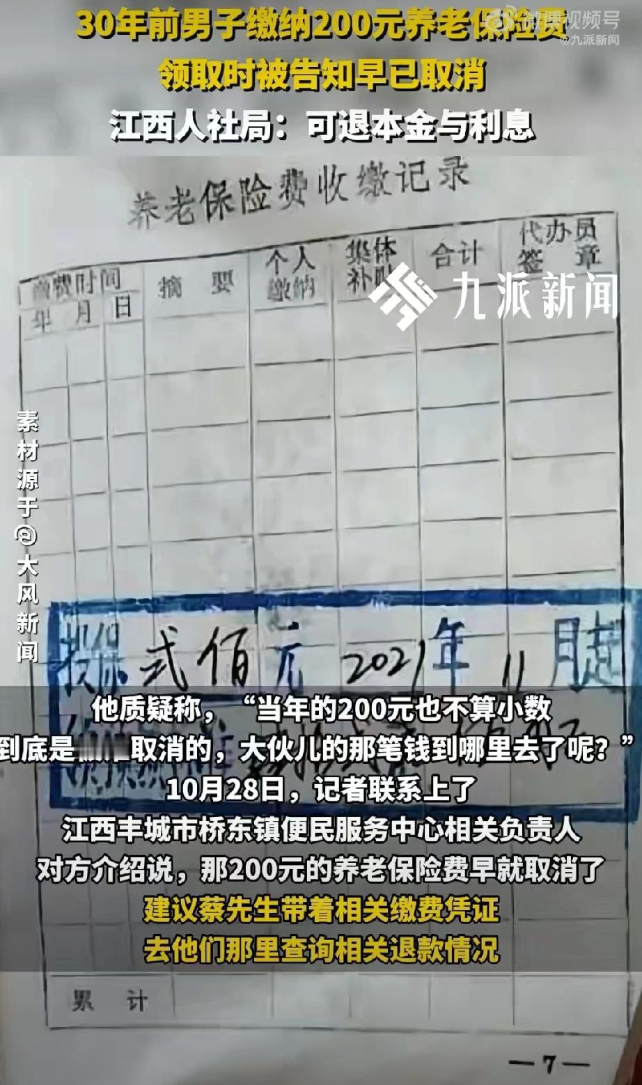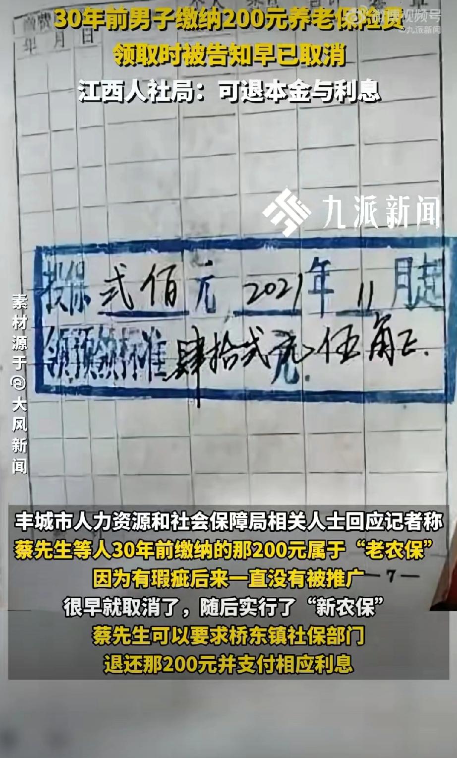 官方回应30年前养老保险被取消:可退本金与利息。(来源:齐鲁晚报)30年前男子被村干部强制要求缴纳200元办理养老保险,领取时遭拒付被告知早已取消。当地人社局:“老农保”有瑕疵未被推广可退款+利息。 点评:早已取消为何不当时通知投保人呢?人家好重新安排养老。钱是强制缴纳的,通知时就是你想不通知就不通知?所谓有瑕疵又是什么?用今天的视角,任何事经过30年都能找到当初行为的不合理性,但要知道信用二字为何物!否则你今天对的承诺会不会将来也可以单方撤销?农村老年社保 养老社保补缴 农村养老金社保