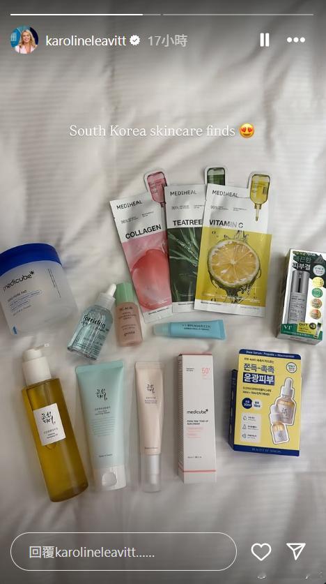 莱维特在Instagram限时动态中分享多张照片,只见她疑似在饭店房间的床上,整齐摆放着13款韩国护肤产品,包括面膜、精华液、防晒乳、护唇膏、卸妆油等,并配上“爱心眼”表情符号,开心写道:“韩国护肤战利品!”充分表达她对韩系美妆的喜爱。