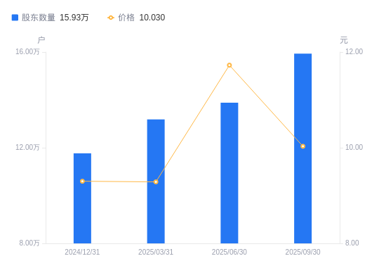 日期A股户数(户)流通A股户均持股数(股)户均持股市值(万元)2025-09-30159305115196.16115.542025-06-30138825132190.34155.012025-03-31131853139180.18129.242024-12-31117654155977.06145.042024-09-30122074150329.51118.442024-06-30135476134855.7993.172024-03-31125266145847.42100.772023-12-31149973121820.0869.432023-09-30133755133776.7782.792023-06-30121930126609.4674.31