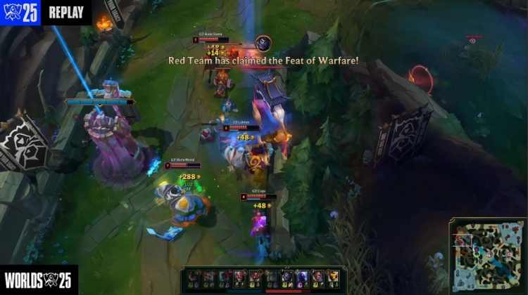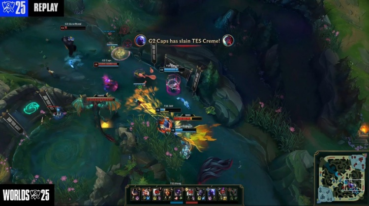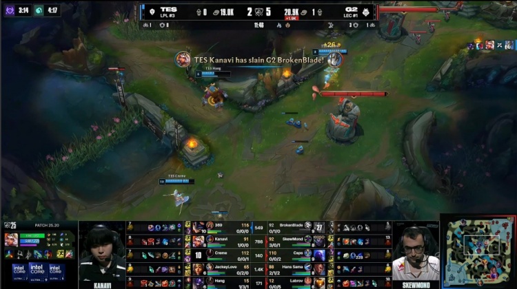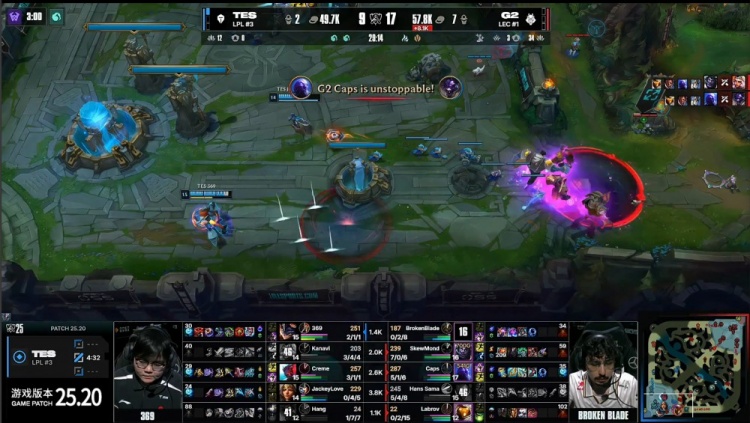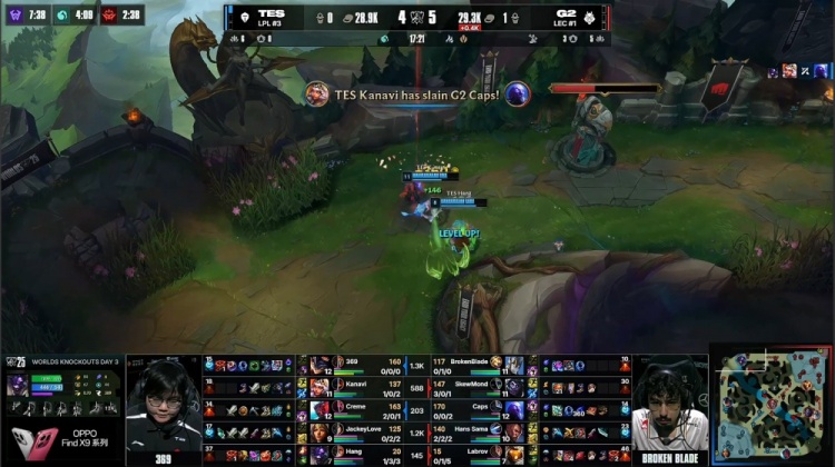[11:48]TES三人中路前后越塔包夹BB加里奥得手,Kanavi奇亚娜拿到人头。G2拿到两条小龙,本局为水龙魂。