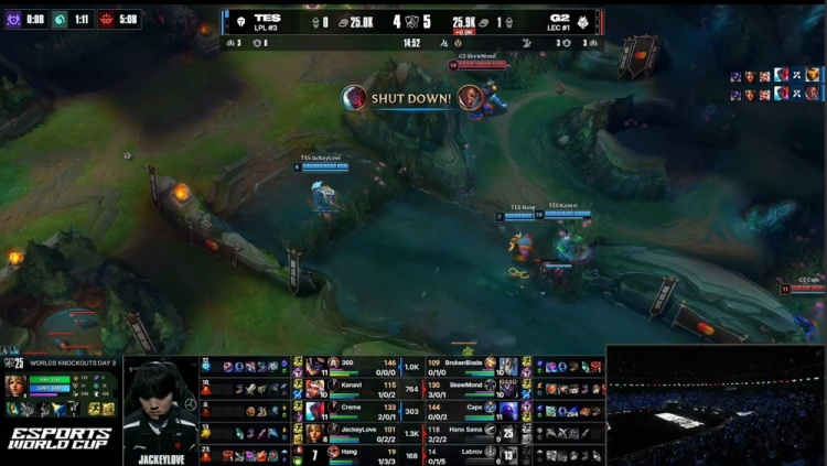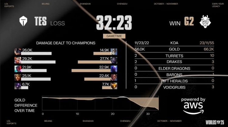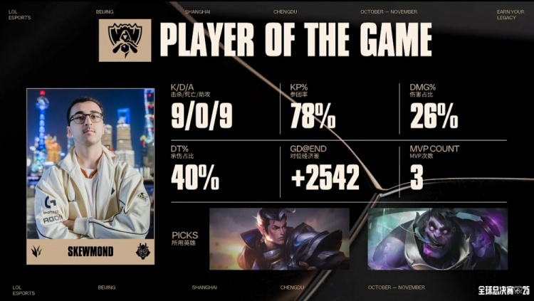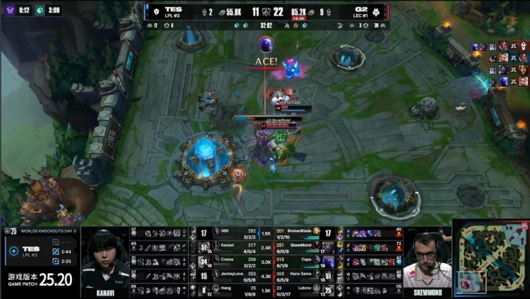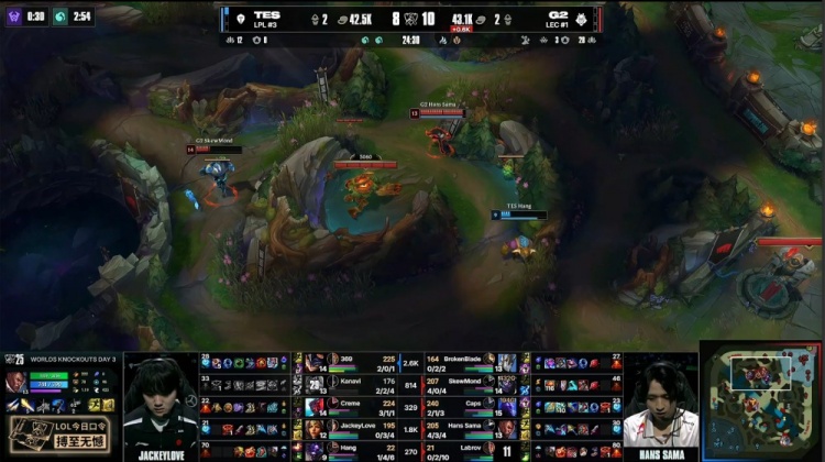 后期G2拍拍大龙吸引TES打团,轻松打出0换3后G2吃掉大龙,经济优势来到5k。最终G2三路推进,SkewMond蒙多无人可挡,G2推平TES三路水晶后拆掉TES基地扳回一城。
