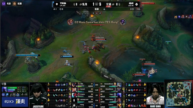 第二局开场哥哥下路炸线,SkewMond蒙多来下帮助G2打出1换2,hang中路河道再送HansSama卢锡安人头,Kanavi奇亚娜中路gank得手后,小龙坑开大推G2双人组助Creme永恩双杀,TES扳平前期2k经济劣势。
