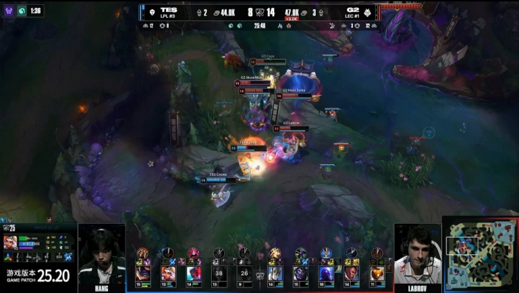 中期hang牛头钻Labrov巴德门被杀,Kanavi抢厄塔汗失败被融,哥哥野区脸探草丛带动TES送头节奏,G2打出0换3拿到2k经济优势。
