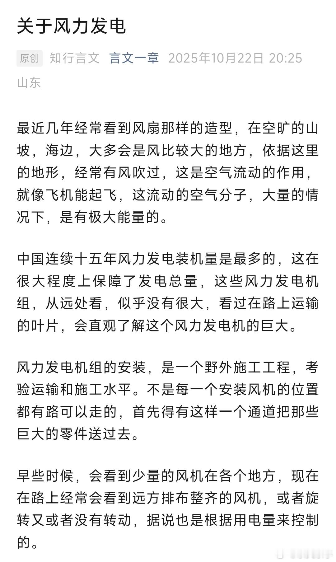中国连续十五年风力发电装机量是最多的,这在很大程度上保障了发电总量,这些风力发电机组,从远处看,似乎没有很大,看过在路上运输的叶片,会直观了解这个风力发电机的巨大。