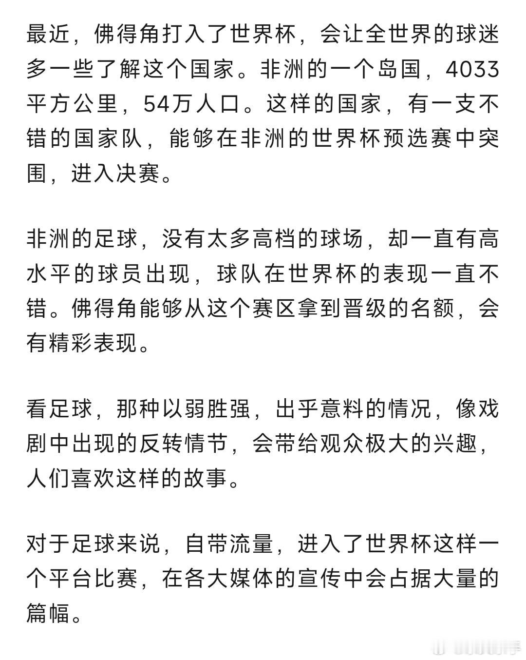 最近,佛得角打入了世界杯,会让全世界的球迷多一些了解这个国家。非洲的一个岛国,4033平方公里,54万人口。这样的国家,有一支不错的国家队,能够在非洲的世界杯预选赛中突围,进入决赛。