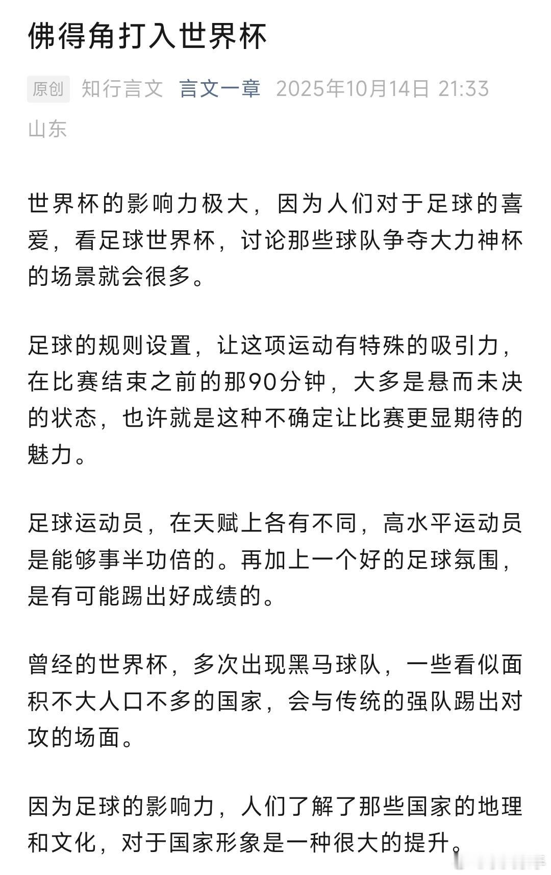 因为足球的影响力,人们了解了那些国家的地理和文化,对于国家形象是一种很大的提升。
